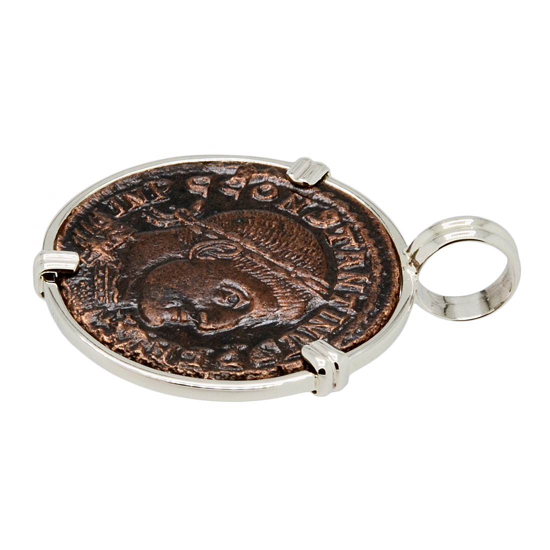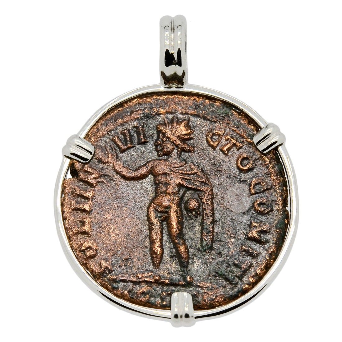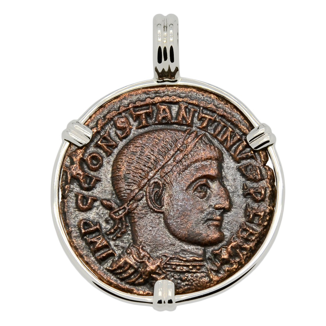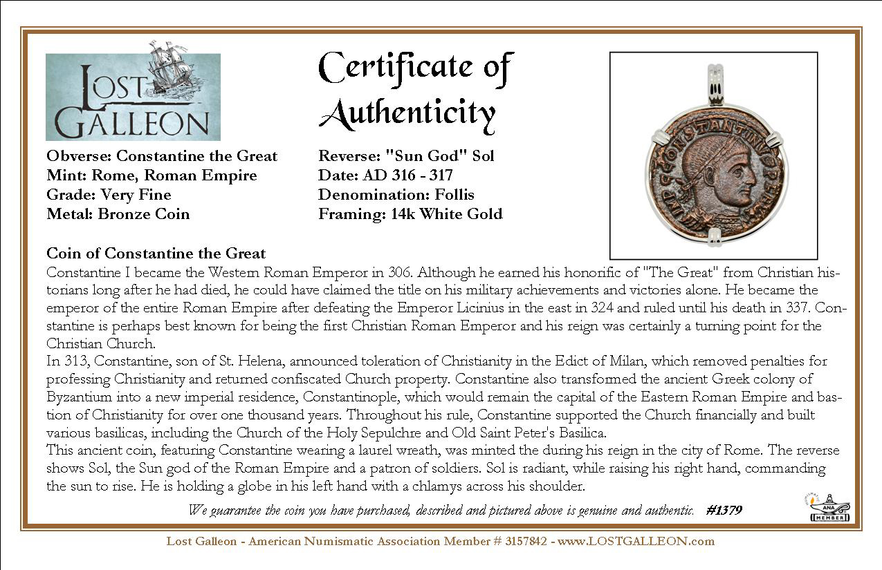 This ancient coin, featuring Constantine wearing a laurel wreath, was minted the during his reign in the city of Rome. The reverse shows Sol, the Sun god of the Roman Empire and a patron of soldiers. Sol is radiant, while raising his right hand, commanding the sun to rise. He is holding a globe in his left hand with a chlamys across his shoulder.