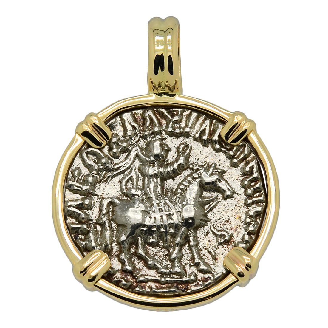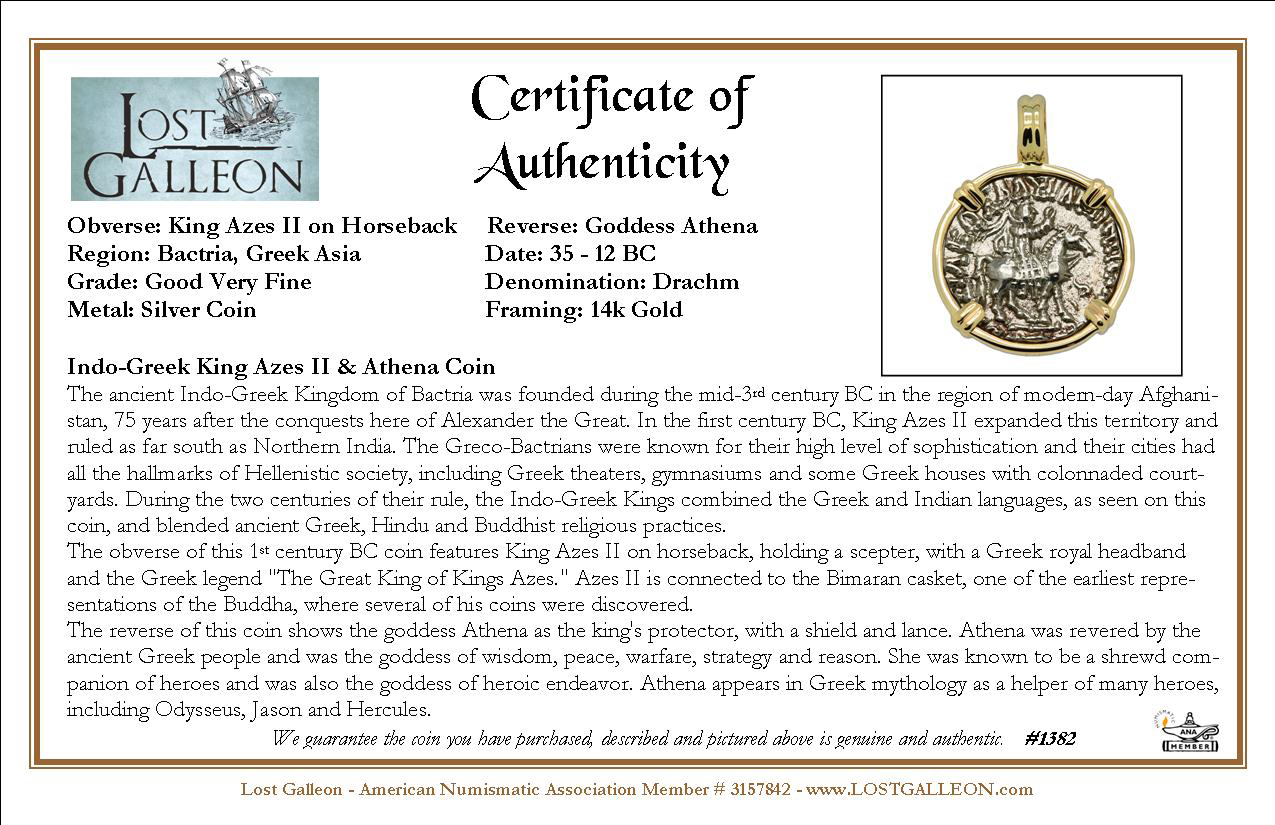 The ancient Indo-Greek Kingdom of Bactria was founded during the mid-3rd century BC in the region of modern-day Afghanistan, 75 years after the conquests here of Alexander the Great. In the first century BC, King Azes II expanded this territory and ruled as far south as Northern India. The Greco-Bactrians were known for their high level of sophistication and their cities had all the hallmarks of Hellenistic society, including Greek theaters, gymnasiums and some Greek houses with colonnaded courtyards. During the two centuries of their rule, the Indo-Greek Kings combined the Greek and Indian languages, as seen on this coin, and blended ancient Greek, Hindu and Buddhist religious practices.