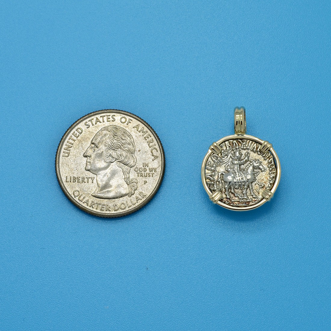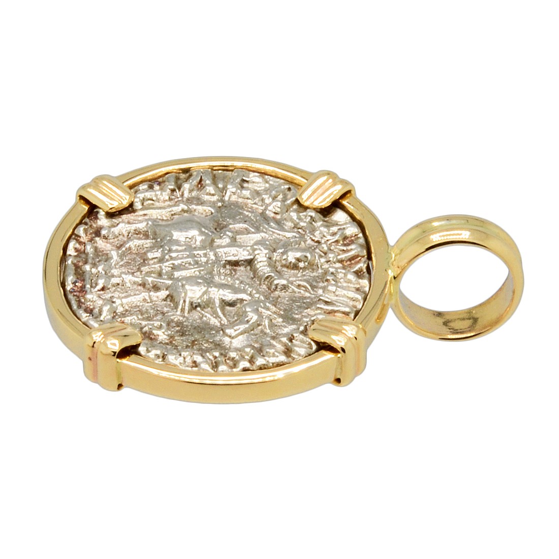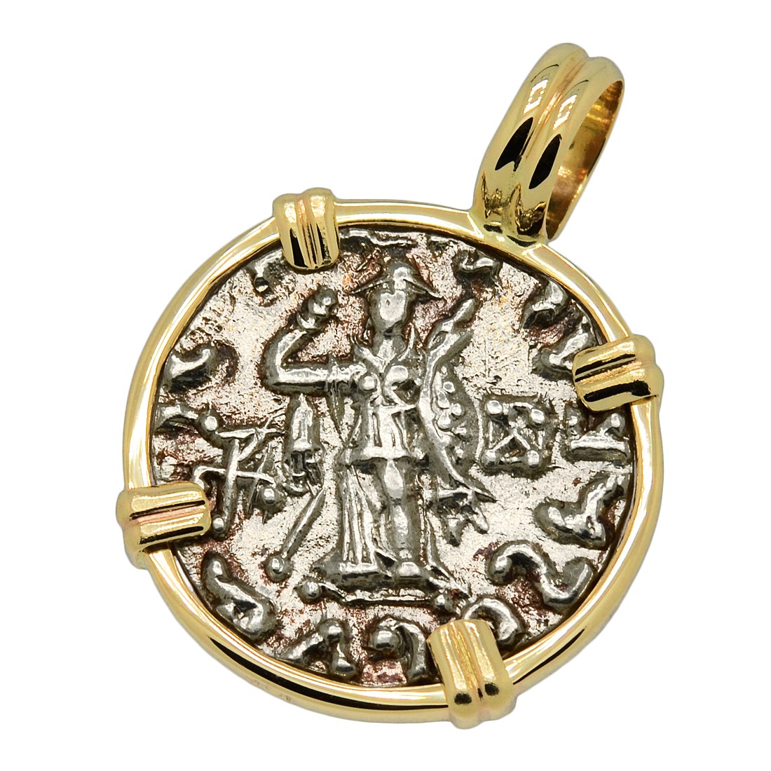 The reverse of this coin shows the goddess Athena as the king's protector, with a shield and lance. Athena was revered by the ancient Greek people and was the goddess of wisdom, peace, warfare, strategy and reason. She was known to be a shrewd companion of heroes and was also the goddess of heroic endeavor. Athena appears in Greek mythology as a helper of many heroes, including Odysseus, Jason and Hercules.