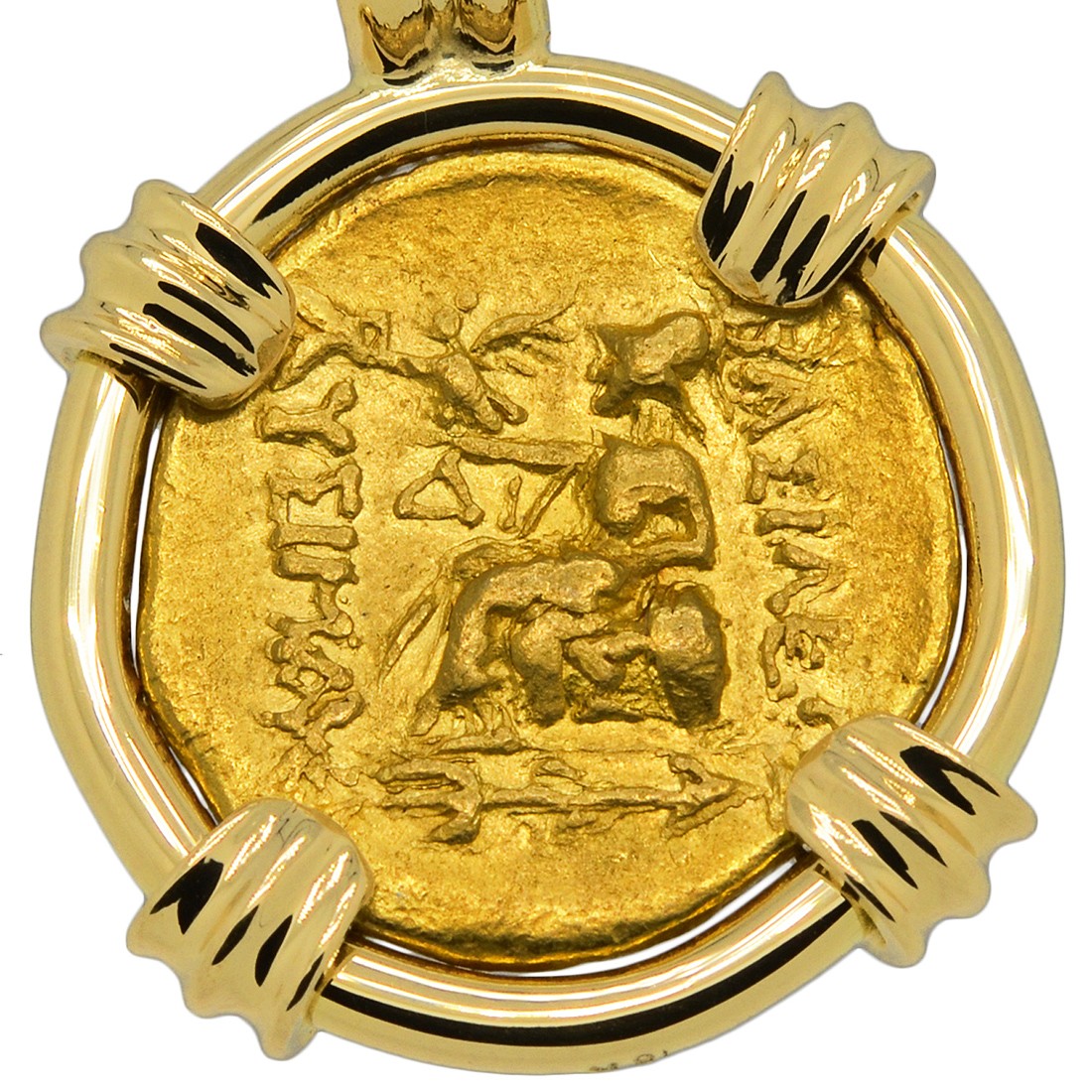 The reverse of this coin shows the armed warrior goddess Athena, seated with a shield, spear and ornamented trident below, while she is holding Nike the goddess of victory. Athena was the goddess of wisdom, peace, warfare, strategy and reason. She was known to be a shrewd companion of heroes and was also the goddess of heroic endeavor.