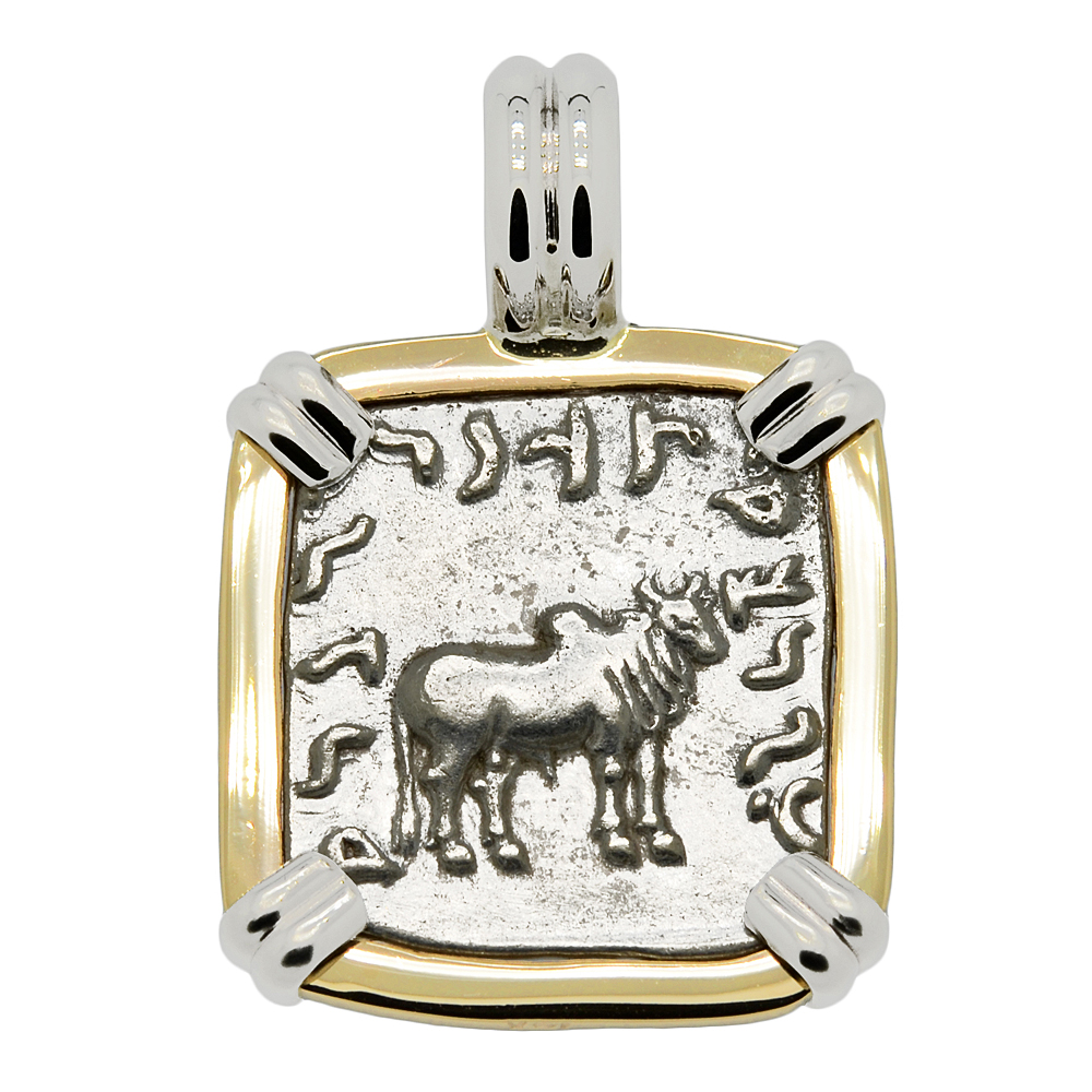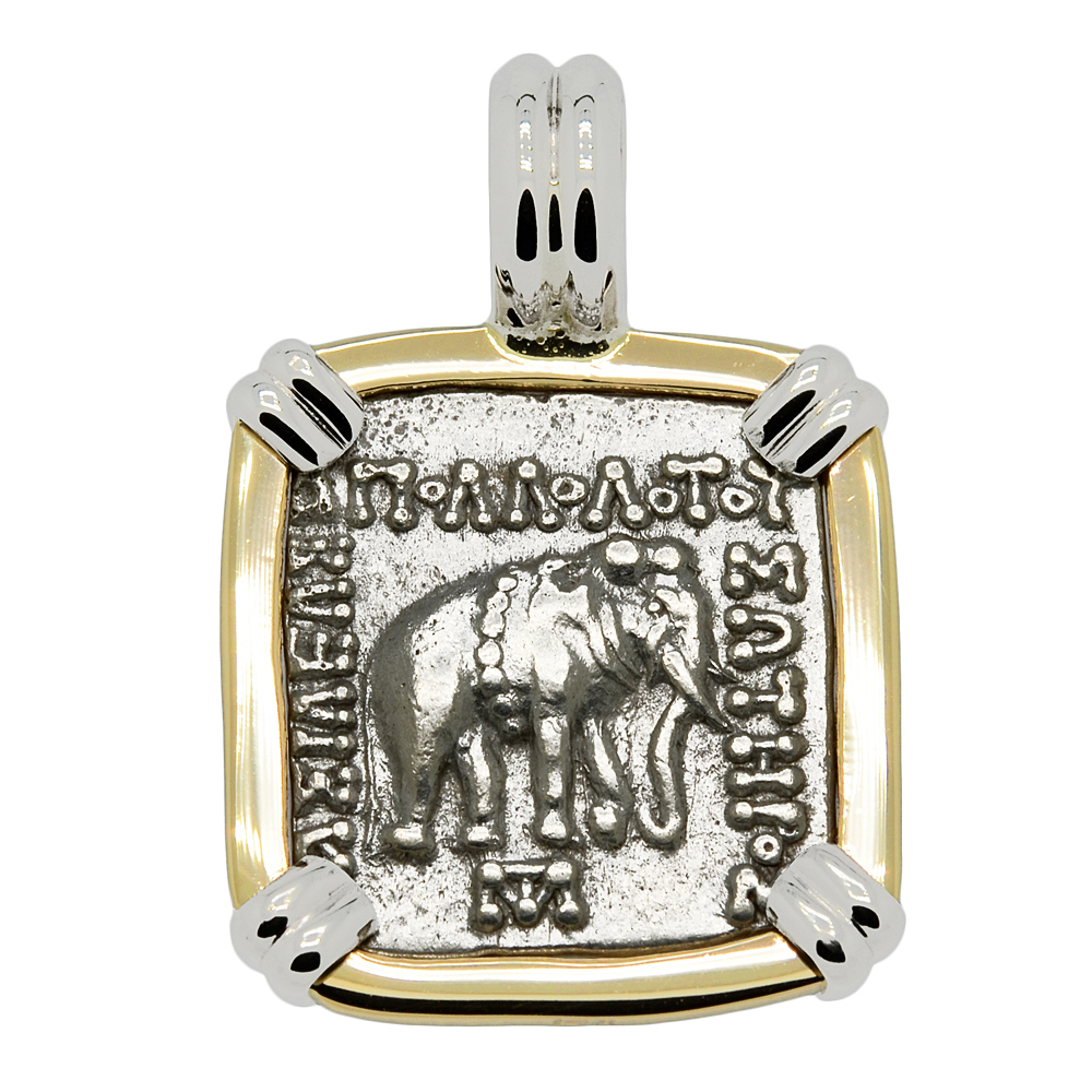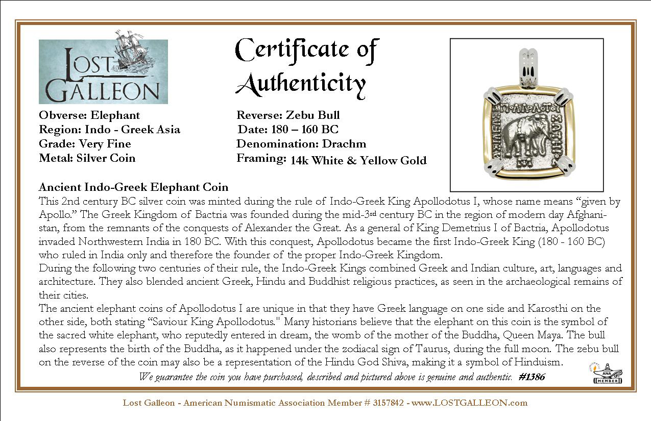 The ancient elephant coins of Apollodotus I are unique in that they have Greek language on one side and Karosthi on the other side, both stating “Saviour King Apollodotus." Many historians believe that the elephant on this coin is the symbol of the sacred white elephant, who reputedly entered in dream, the womb of the mother of the Buddha, Queen Maya. The bull also represents the birth of the Buddha, as it happened under the zodiacal sign of Taurus, during the full moon. The zebu bull on the reverse of the coin may also be a representation of the Hindu God Shiva, making it a symbol of Hinduism.