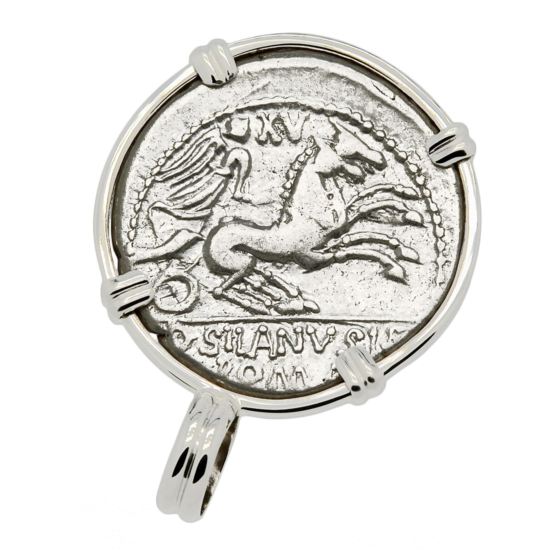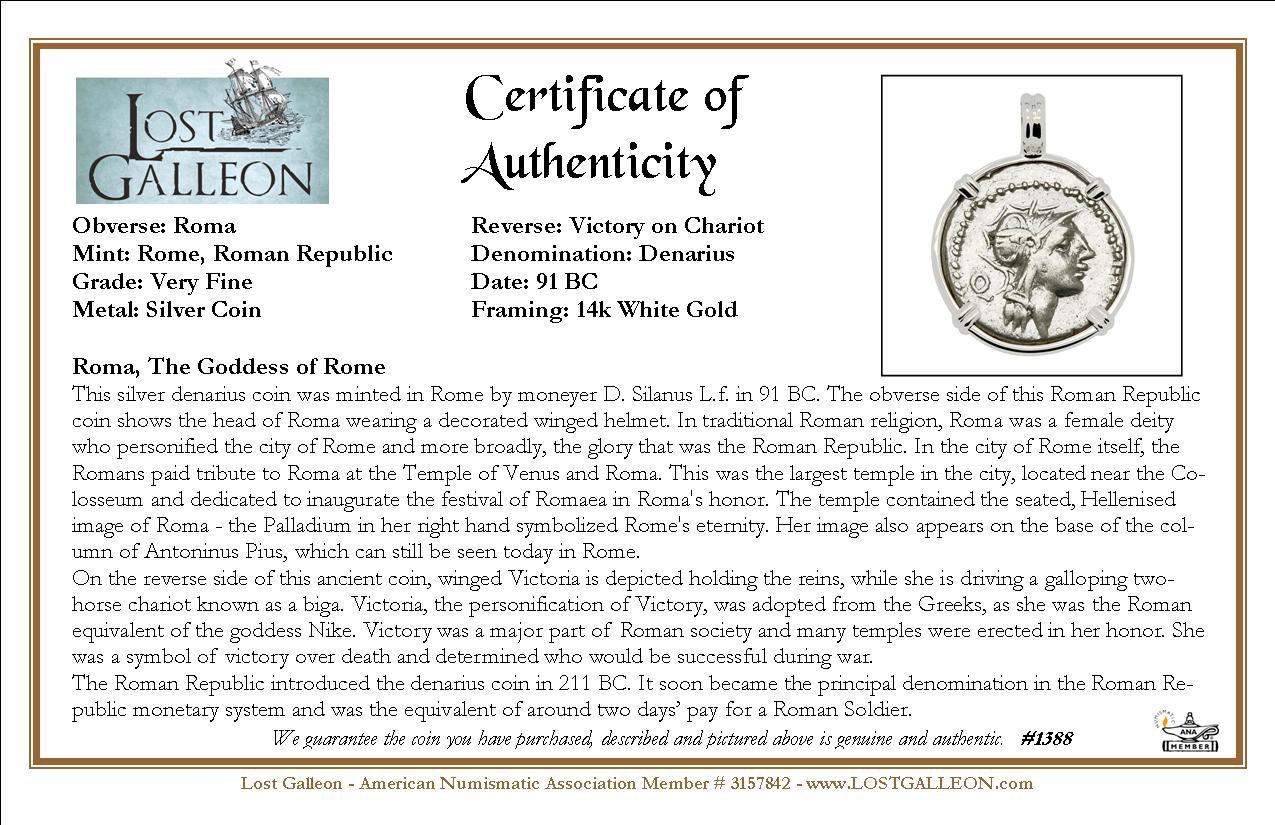 This silver denarius coin was minted in Rome by moneyer D. Silanus L.f. in 91 BC. The obverse side of this Roman Republic coin shows the head of Roma wearing a decorated winged helmet. In traditional Roman religion, Roma was a female deity who personified the city of Rome and more broadly, the glory that was the Roman Republic. In the city of Rome itself, the Romans paid tribute to Roma at the Temple of Venus and Roma. This was the largest temple in the city, located near the Colosseum and dedicated to inaugurate the festival of Romaea in Roma's honor. The temple contained the seated, Hellenised image of Roma - the Palladium in her right hand symbolized Rome's eternity. Her image also appears on the base of the column of Antoninus Pius, which can still be seen today in Rome.