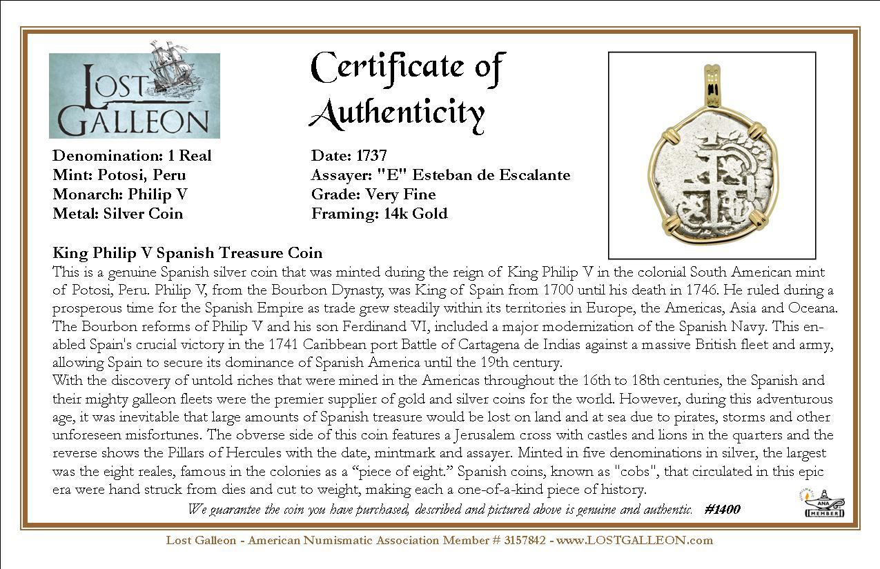 This is a genuine Spanish silver coin that was minted during the reign of King Philip V in the colonial South American mint of Potosi, Peru. Philip V, from the Bourbon Dynasty, was King of Spain from 1700 until his death in 1746. He ruled during a prosperous time for the Spanish Empire as trade grew steadily within its territories in Europe, the Americas, Asia and Oceana. The Bourbon reforms of Philip V and his son Ferdinand VI, included a major modernization of the Spanish Navy. This enabled Spain's crucial victory in the 1741 Caribbean port Battle of Cartagena de Indias against a massive British fleet and army, allowing Spain to secure its dominance of Spanish America until the 19th century.