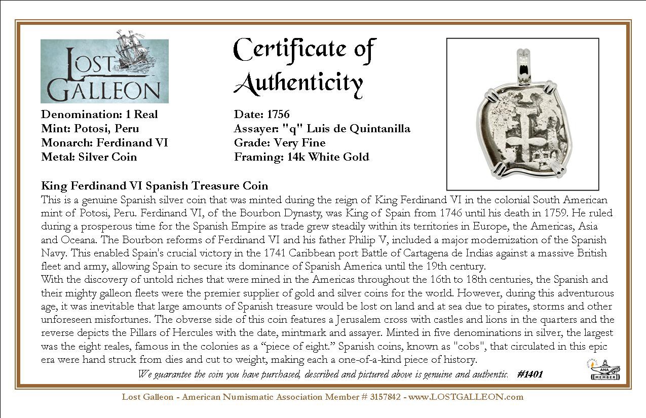 This is a genuine Spanish silver coin that was minted during the reign of King Ferdinand VI in the colonial South American mint of Potosi, Peru. Ferdinand VI, of the Bourbon Dynasty, was King of Spain from 1746 until his death in 1759. He ruled during a prosperous time for the Spanish Empire as trade grew steadily within its territories in Europe, the Americas, Asia and Oceana. The Bourbon reforms of Ferdinand VI and his father Philip V, included a major modernization of the Spanish Navy. This enabled Spain's crucial victory in the 1741 Caribbean port Battle of Cartagena de Indias against a massive British fleet and army, allowing Spain to secure its dominance of Spanish America until the 19th century.