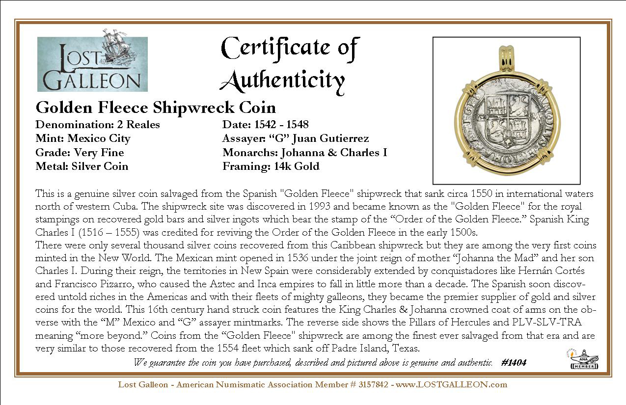 This is a genuine silver coin salvaged from the Spanish "Golden Fleece" shipwreck that sank circa 1550 in international waters north of western Cuba. The shipwreck site was discovered in 1993 and became known as the "Golden Fleece" for the royal stampings on recovered gold bars and silver ingots which bear the stamp of the “Order of the Golden Fleece.” Spanish King Charles I (1516 – 1555) was credited for reviving the Order of the Golden Fleece in the early 1500s.