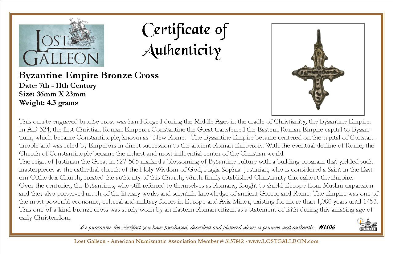 This ornate engraved bronze cross was hand forged during the Middle Ages in the cradle of Christianity, the Byzantine Empire. In AD 324, the first Christian Roman Emperor Constantine the Great transferred the Eastern Roman Empire capital to Byzantium, which became Constantinople, known as "New Rome." The Byzantine Empire became centered on the capital of Constantinople and was ruled by Emperors in direct succession to the ancient Roman Emperors. With the eventual decline of Rome, the Church of Constantinople became the richest and most influential center of the Christian world.