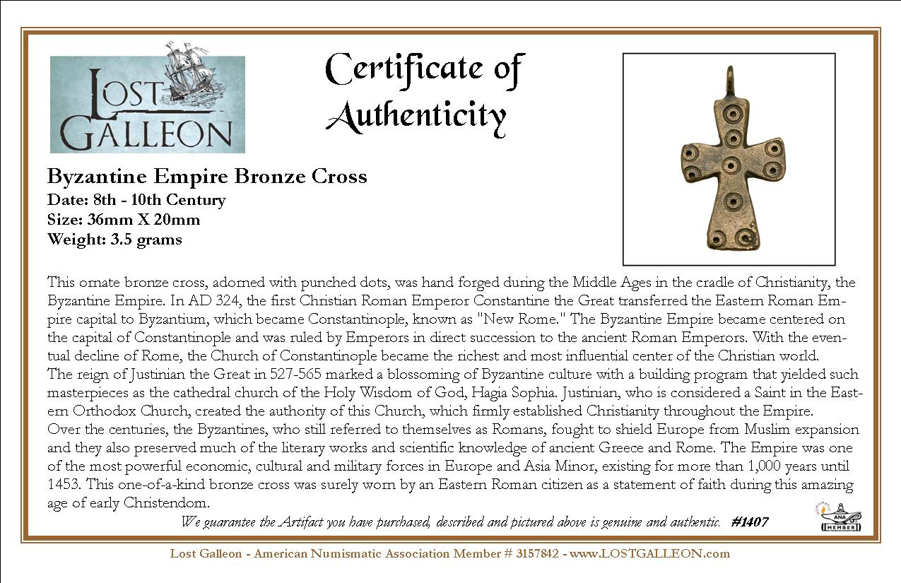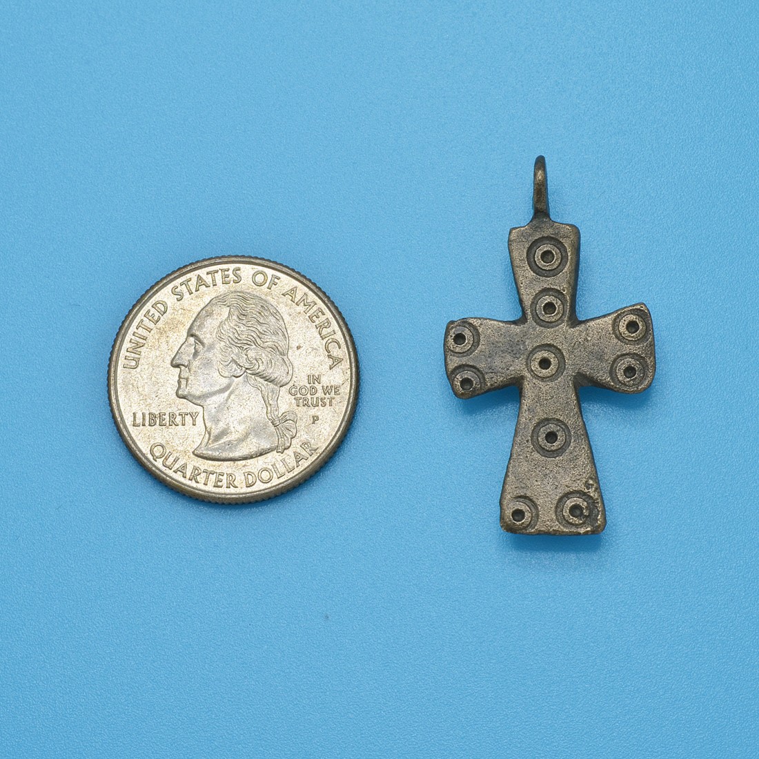 This ornate bronze cross, adorned with punched dots, was hand forged during the Middle Ages in the cradle of Christianity, the Byzantine Empire. In AD 324, the first Christian Roman Emperor Constantine the Great transferred the Eastern Roman Empire capital to Byzantium, which became Constantinople, known as "New Rome." The Byzantine Empire became centered on the capital of Constantinople and was ruled by Emperors in direct succession to the ancient Roman Emperors. With the eventual decline of Rome, the Church of Constantinople became the richest and most influential center of the Christian world.