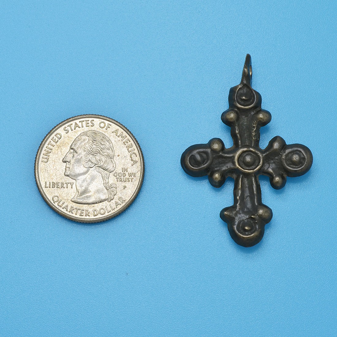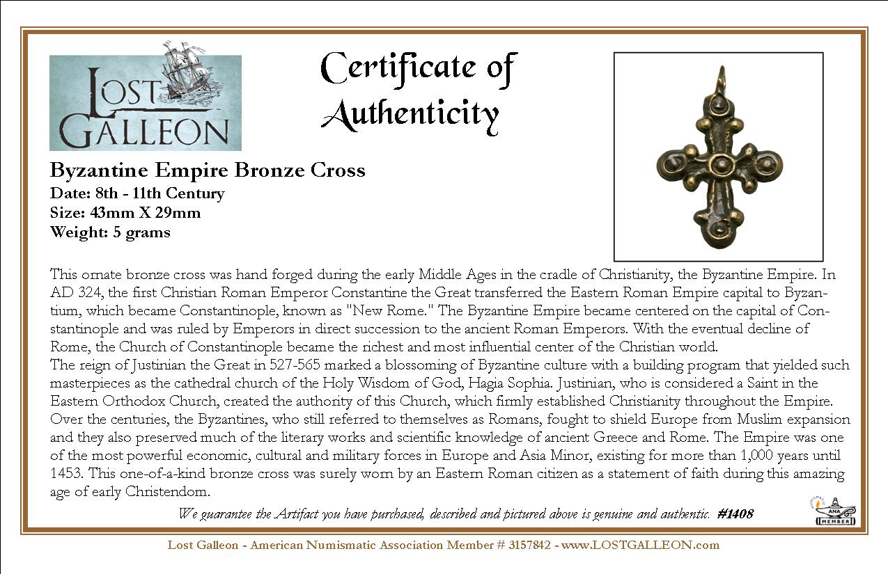 Over the centuries, the Byzantines, who still referred to themselves as Romans, fought to shield Europe from Muslim expansion and they also preserved much of the literary works and scientific knowledge of ancient Greece and Rome. The Empire was one of the most powerful economic, cultural and military forces in Europe and Asia Minor, existing for more than 1,000 years until 1453. This one-of-a-kind bronze cross was surely worn by an Eastern Roman citizen as a statement of faith during this amazing age of early Christendom.