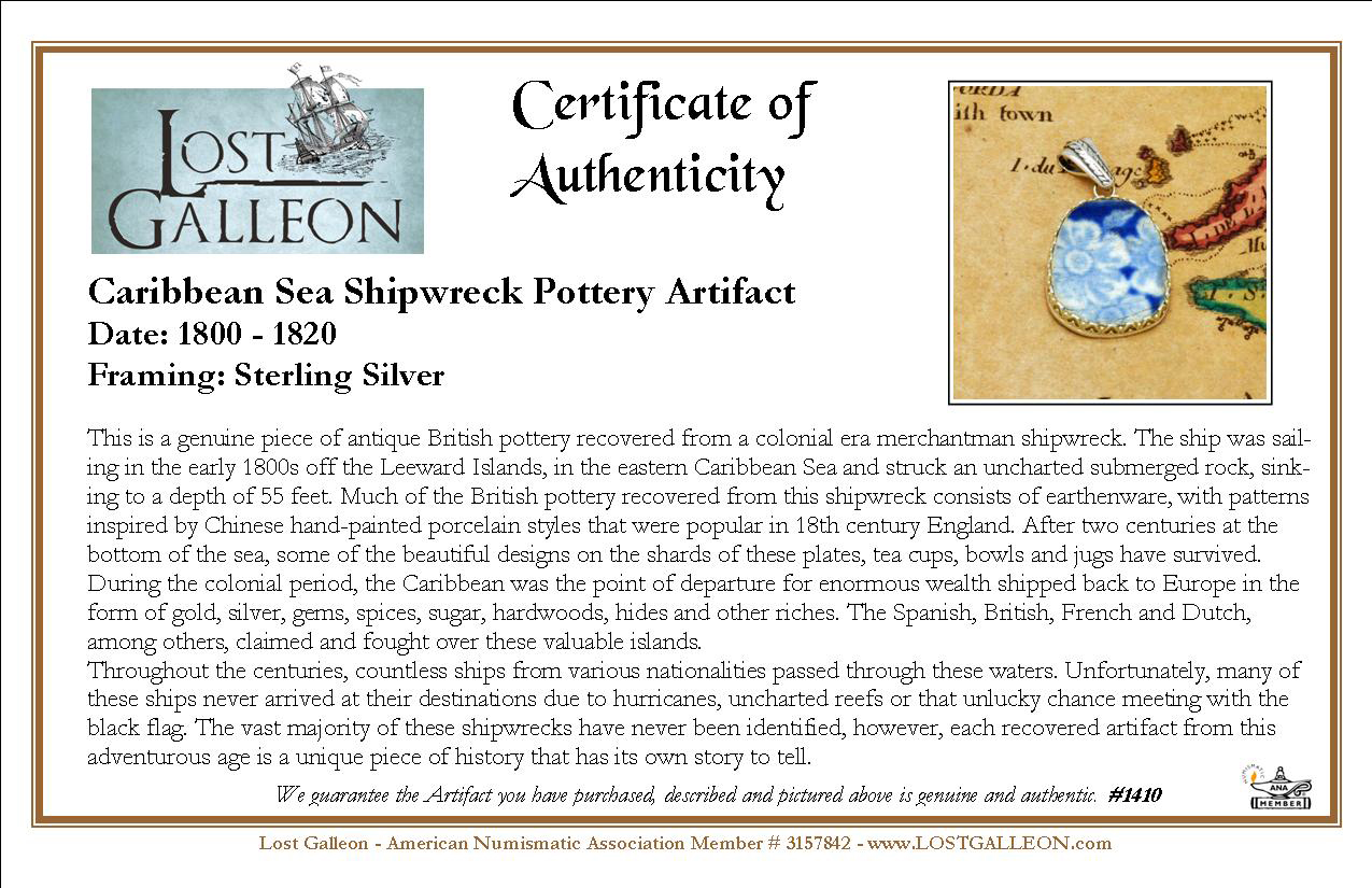 This is a genuine piece of antique British pottery recovered from a colonial era merchantman shipwreck. The ship was sailing in the early 1800s off the Leeward Islands, in the eastern Caribbean Sea and struck an uncharted submerged rock, sinking to a depth of 55 feet. Much of the British pottery recovered from this shipwreck consists of earthenware, with patterns inspired by Chinese hand-painted porcelain styles that were popular in 18th century England. After two centuries at the bottom of the sea, some of the beautiful designs on the shards of these plates, tea cups, bowls and jugs have survived.
