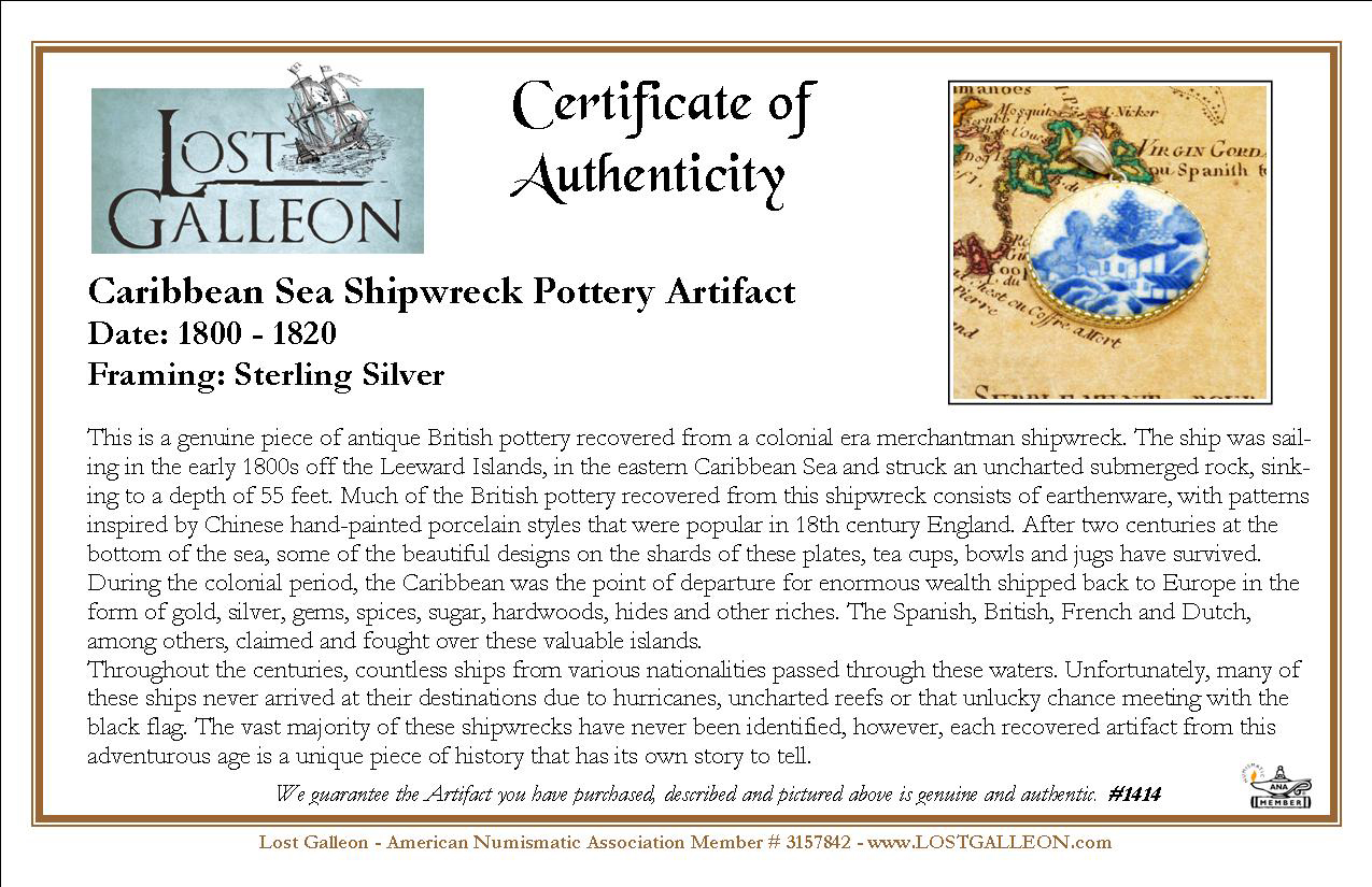 This is a genuine piece of antique British pottery recovered from a colonial era merchantman shipwreck. The ship was sailing in the early 1800s off the Leeward Islands, in the eastern Caribbean Sea and struck an uncharted submerged rock, sinking to a depth of 55 feet. Much of the British pottery recovered from this shipwreck consists of earthenware, with patterns inspired by Chinese hand-painted porcelain styles that were popular in 18th century England. After two centuries at the bottom of the sea, some of the beautiful designs on the shards of these plates, tea cups, bowls and jugs have survived.