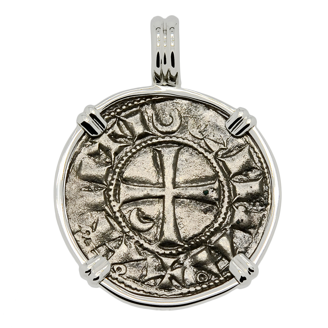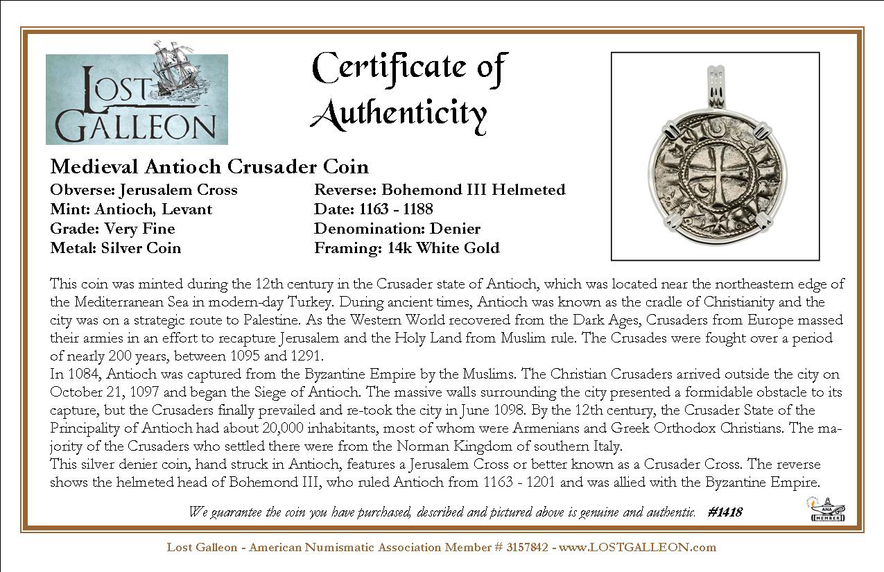 This silver denier coin, hand struck in Antioch, features a Jerusalem Cross or better known as a Crusader Cross. The reverse shows the helmeted head of Bohemond III, who ruled Antioch from 1163 - 1201 and was allied with the Byzantine Empire.