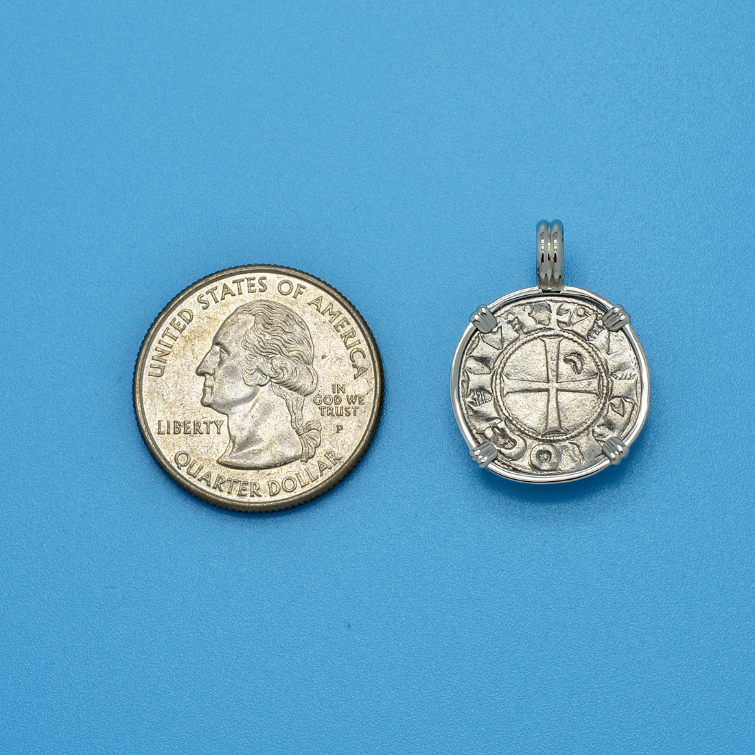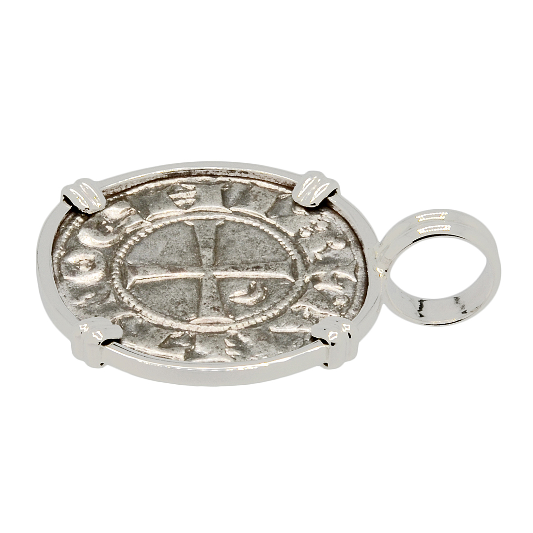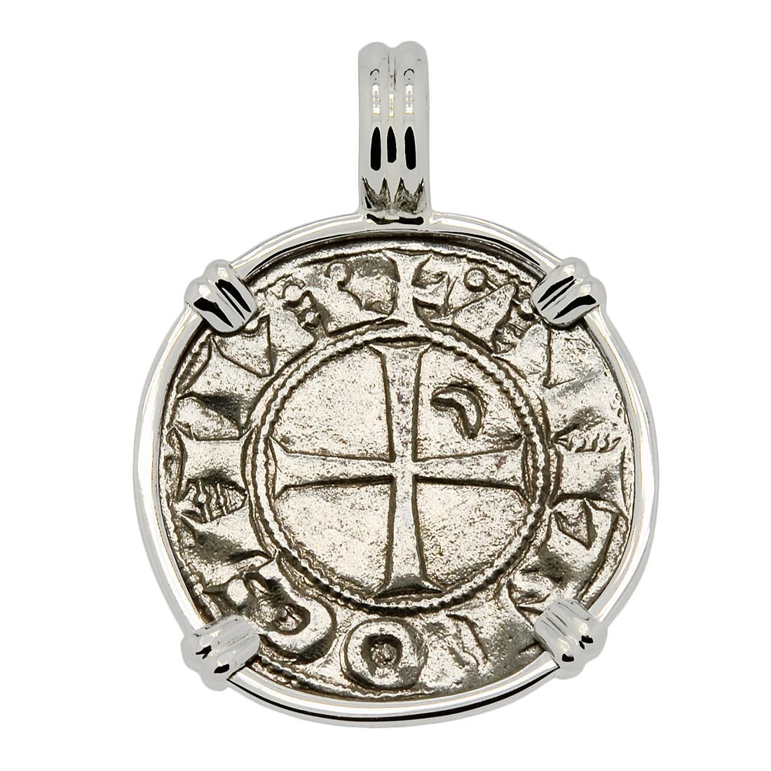 This silver denier coin, hand struck in Antioch, features a Jerusalem Cross or better known as a Crusader Cross. The reverse shows the helmeted head of Bohemond III, who ruled Antioch from 1163 - 1201 and was allied with the Byzantine Empire.