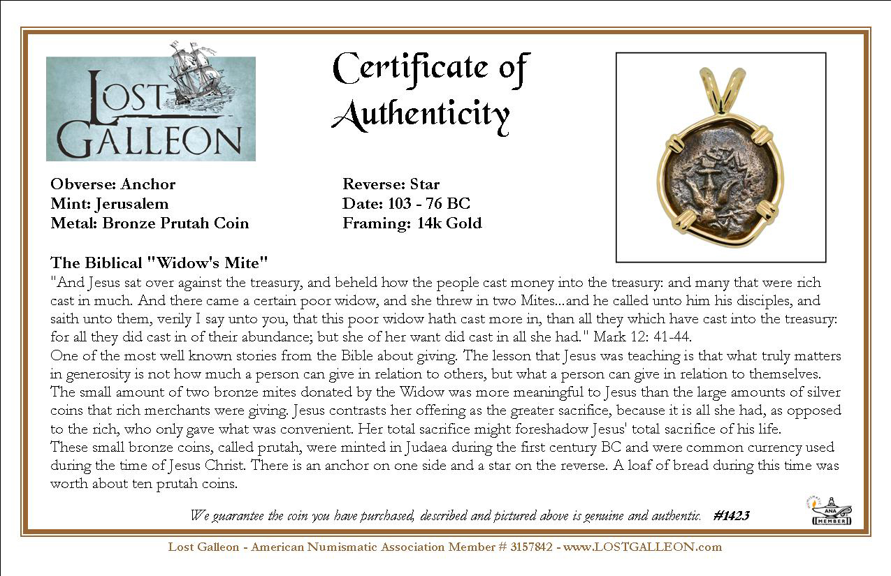 These small bronze coins, called prutah, were minted in Judaea during the first century BC and were common currency used during the time of Christ. There is an anchor on one side and a star on the reverse. A loaf of bread during this time was worth about ten prutah coins.