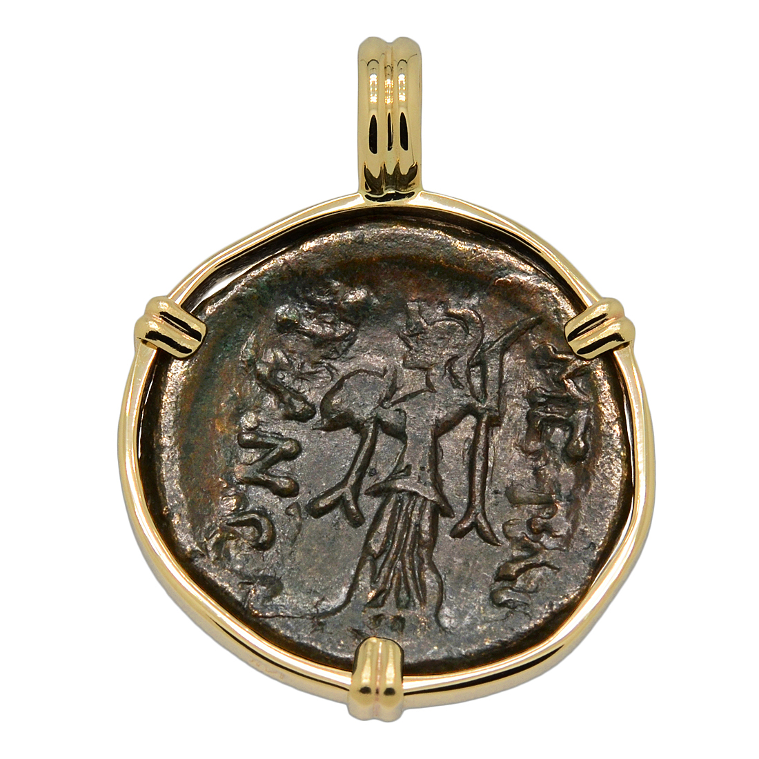 Athena, brandishing a spear and holding a shield, is shown on the reverse of this coin. Athena was the goddess of wisdom, peace, warfare, strategy and reason. An armed warrior goddess, Athena appears in Greek mythology as a helper of many heroes, including Odysseus, Jason and Hercules.
