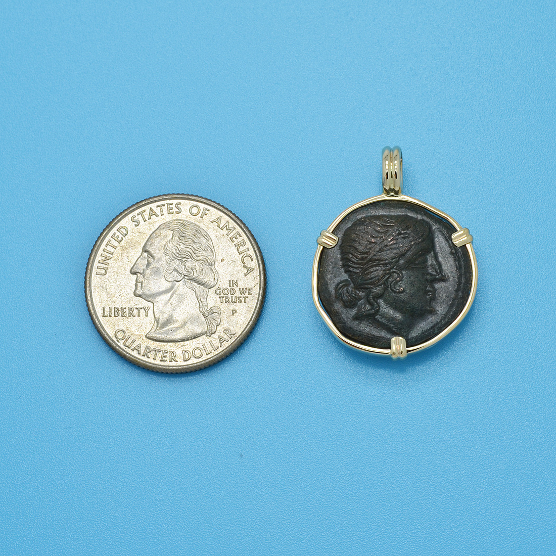 The obverse of this bronze coin features the head of an Amazon. In Greek mythology, the Amazons were a tribe of warrior women from the south coast of the Black Sea who were famous for their riding skills, courage and pride. Two of the most famous Amazon Queens were both daughters of Ares, the god of war. Queen Penthesilea, fought in the Trojan War and was killed by Achilles, but after taking off her helmet, Achilles falls in love with Penthesilea. In another epic story, her sister Queen Hippolyta possessed a magical girdle that was sought after by Hercules in his ninth labour. Amazon warriors were often depicted in battle with Greek heroes and according to legend, the Amazons invented the cavalry.