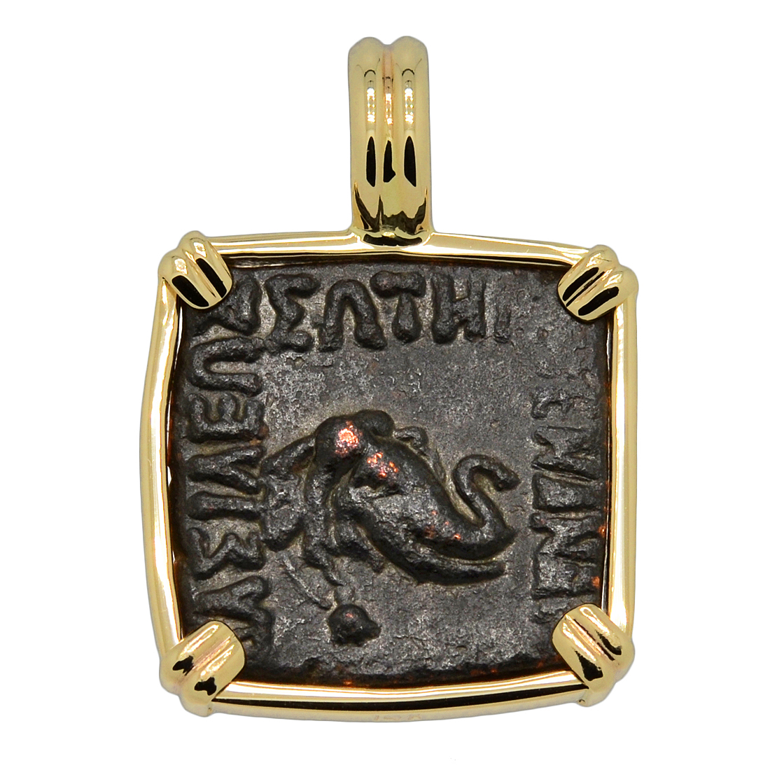 This 2nd century BC coin, features the head of an elephant with a bell around its neck. Many historians believe that the elephant on this coin is a symbol of the sacred white elephant, who reputedly entered in dream the womb of the mother of the Buddha, Queen Maya. The reverse side of this coin depicts the club of the greatest Greek hero, Hercules. The legend reads in Greek language on the obverse side and Karosthi on the reverse side, both stating “Savior King Menander."