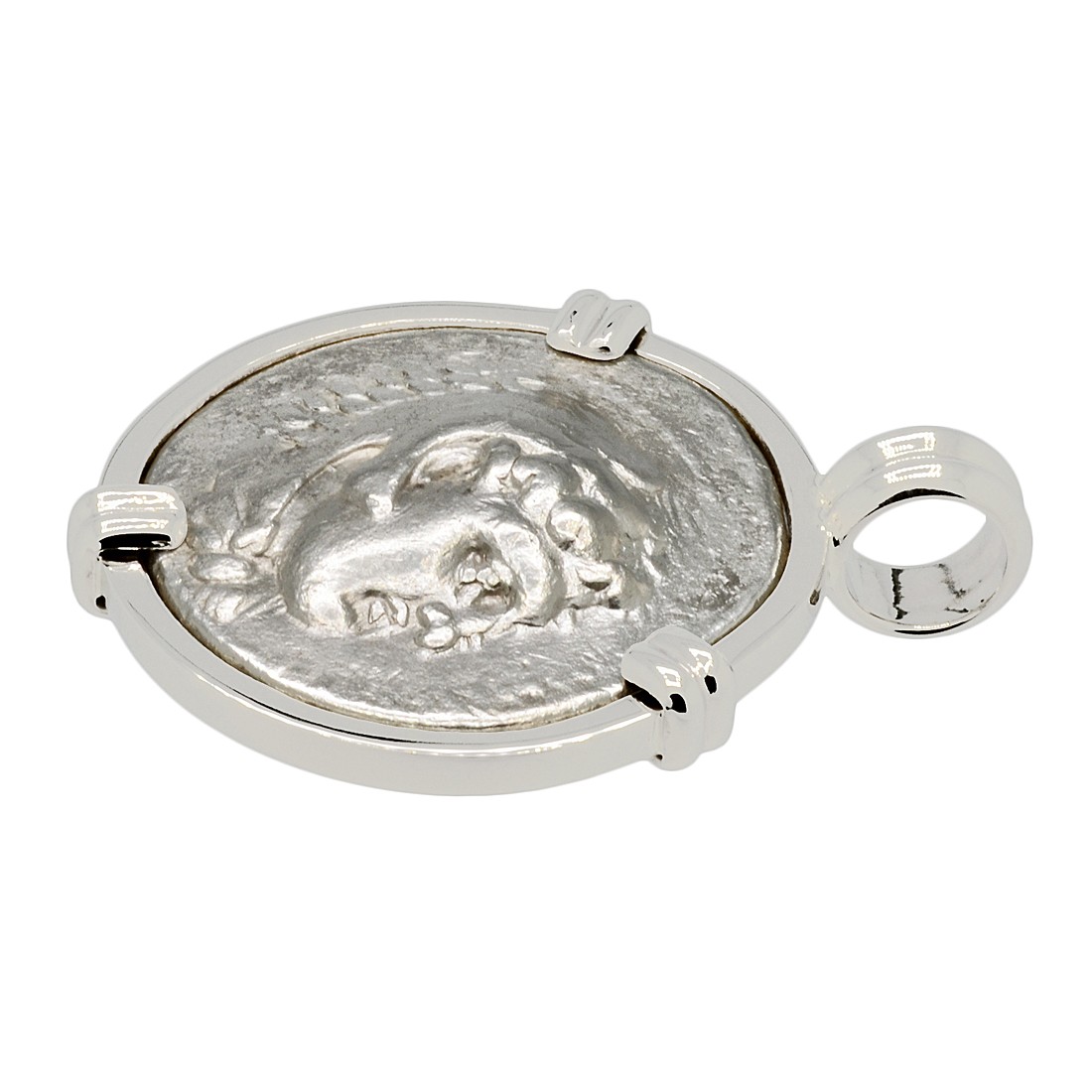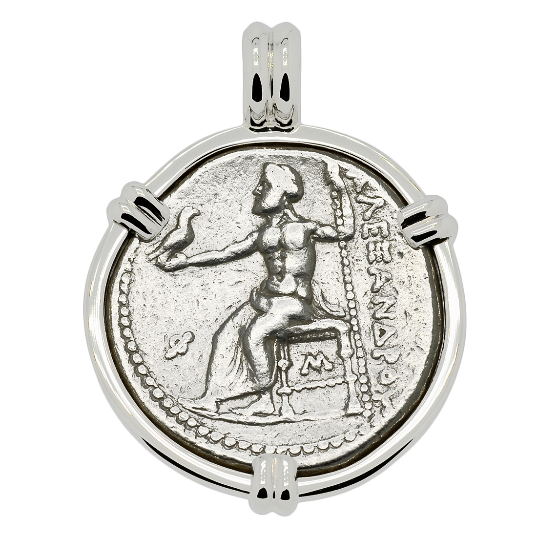 The obverse of this coin, shows the Greek hero Hercules wearing a lion’s skin of armor. This was important to Alexander's hereditary line as he claimed to be descended from the mythological hero. The reverse shows Zeus, the king of the Greek gods, seated on a throne and holding an eagle with Alexander’s name to the right. Zeus was the most powerful of all the Greek gods and his appearance on Alexander's coinage symbolized Alexander's status as leader of all the Greeks.