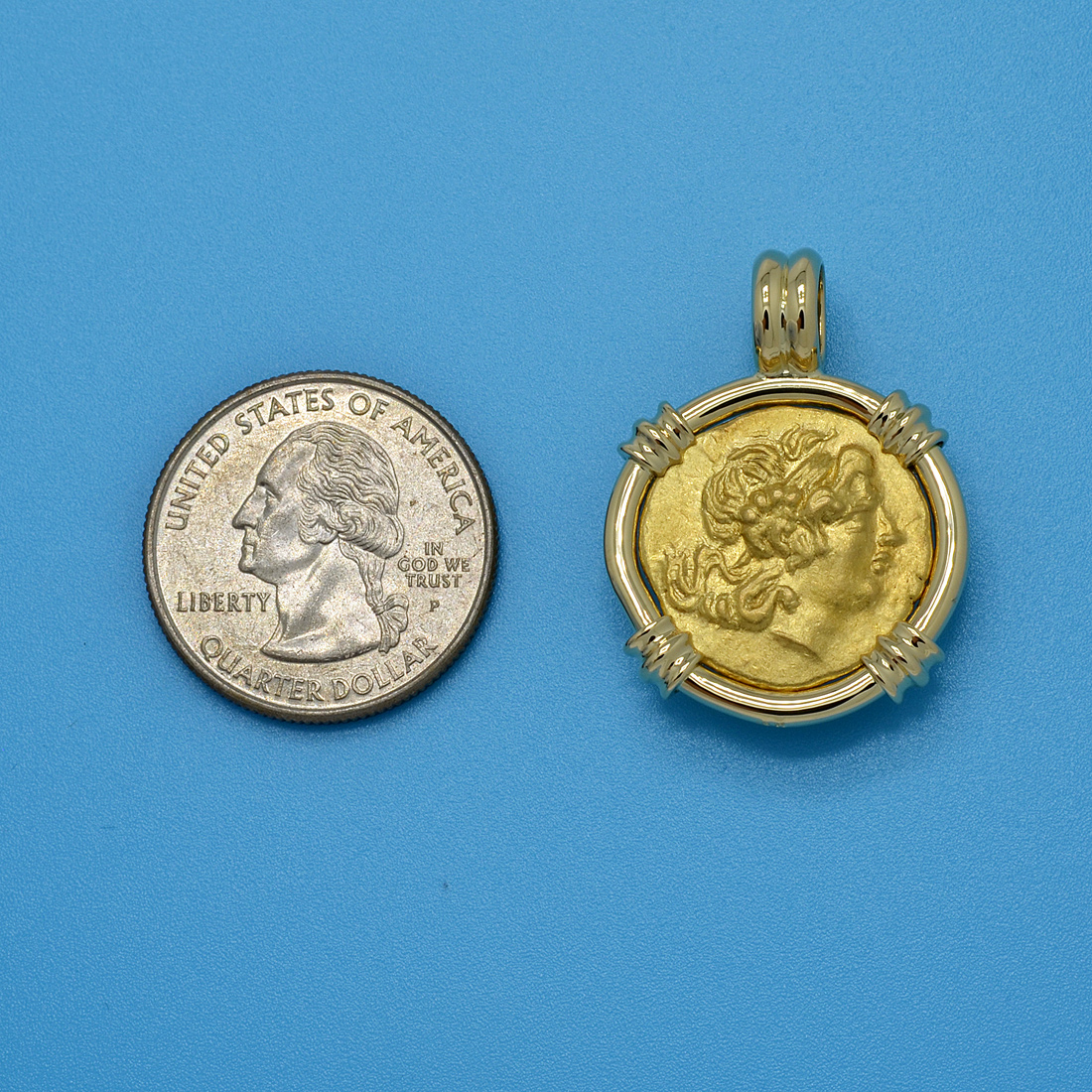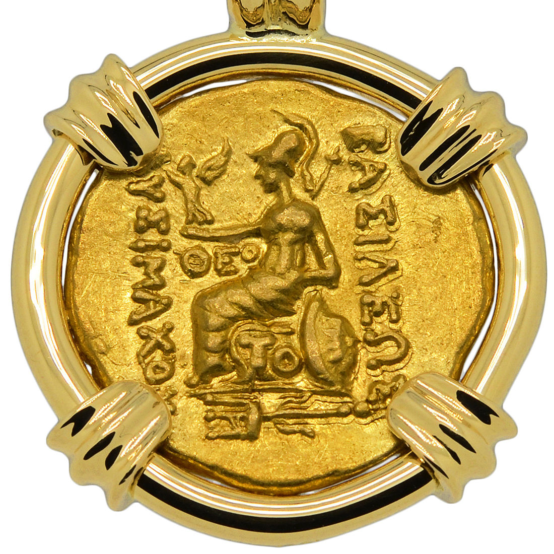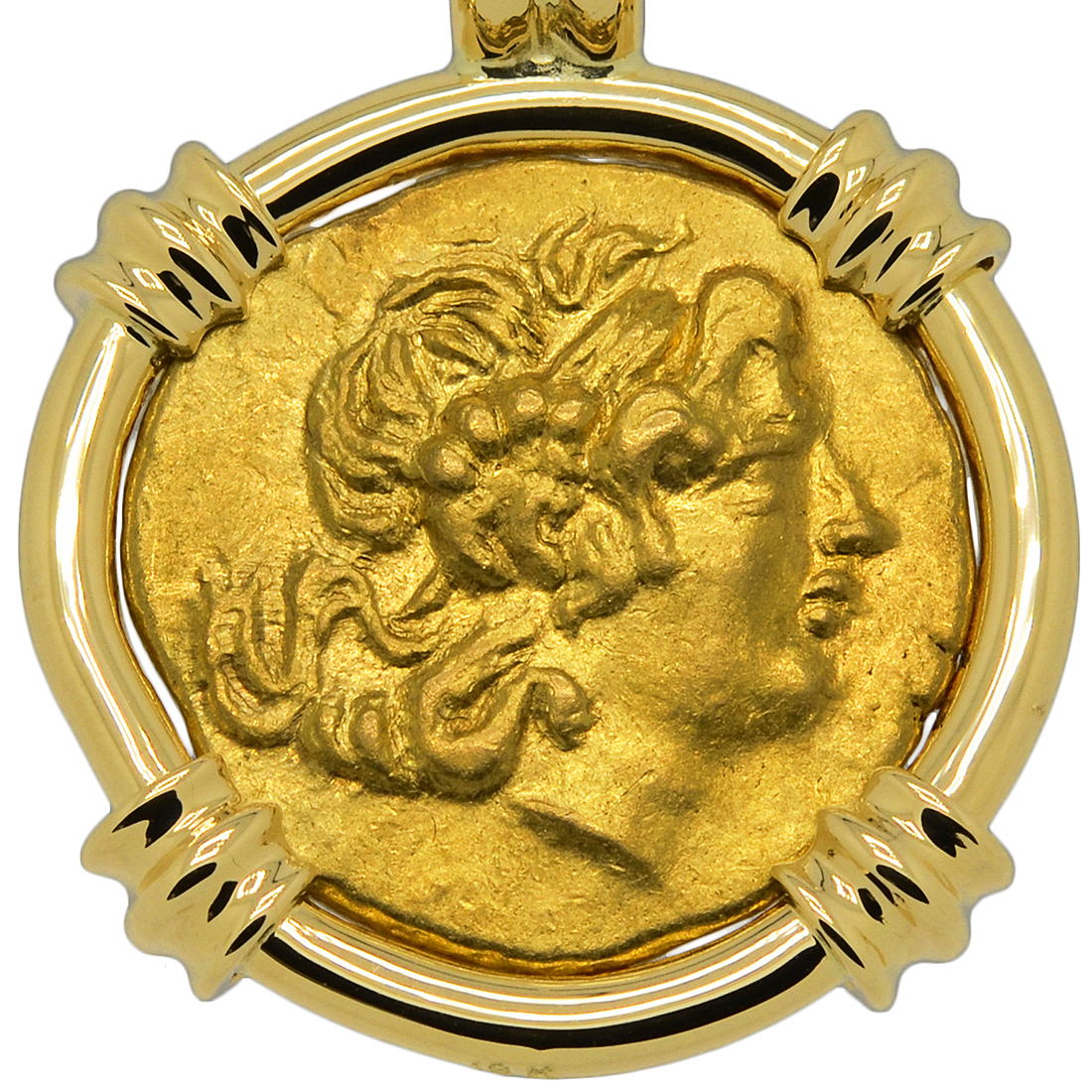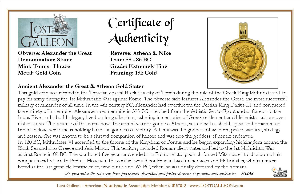 This gold coin was minted in the Thracian coastal Black Sea city of Tomis during the rule of the Greek King Mithridates VI to pay his army during the 1st Mithradatic War against Rome. The obverse side features Alexander the Great, the most successful military commander of all time. In the 4th century BC, Alexander had overthrown the Persian King Darius III and conquered the entirety of his empire. Alexander's own empire in 323 BC stretched from the Adriatic Sea to Egypt and as far east as the Indus River in India. His legacy lived on long after him, ushering in centuries of Greek settlement and Hellenistic culture over distant areas.