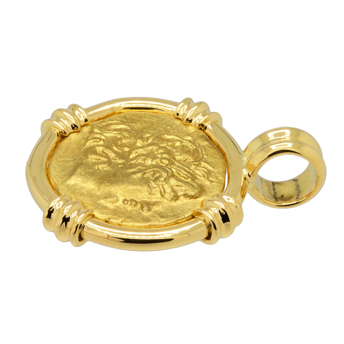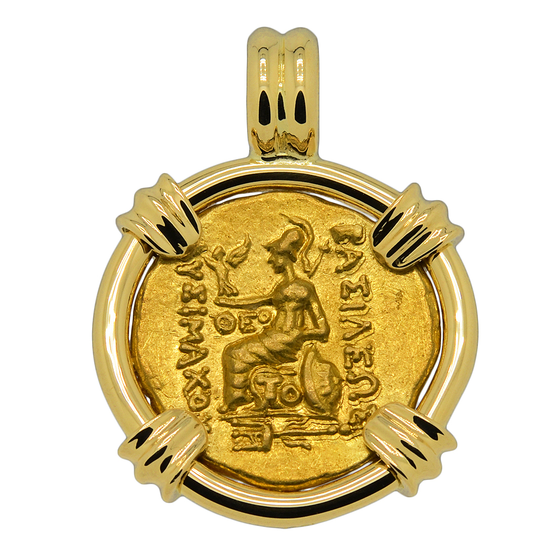 The reverse of this coin shows the armed warrior goddess Athena, seated with a shield, spear and ornamented trident below, while she is holding Nike the goddess of victory. Athena was the goddess of wisdom, peace, warfare, strategy and reason. She was known to be a shrewd companion of heroes and was also the goddess of heroic endeavor.