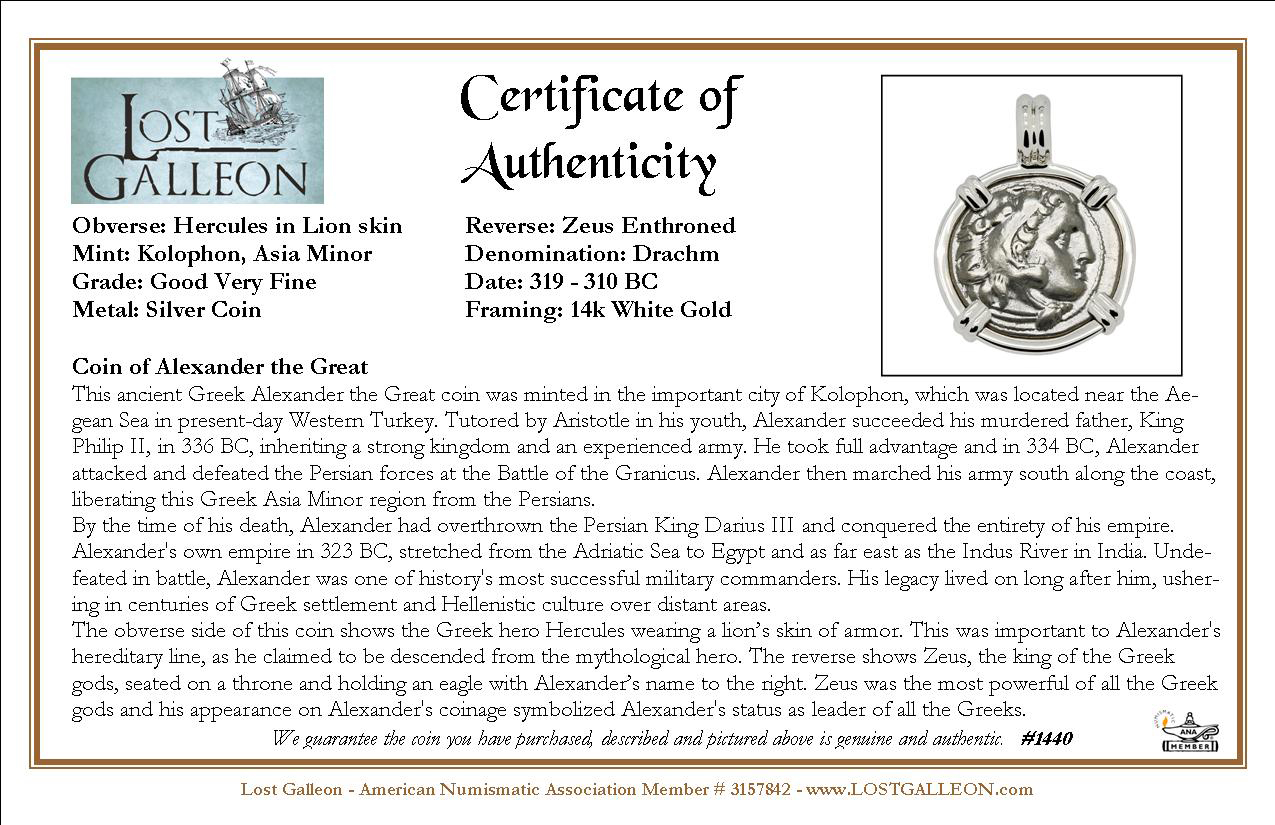 This ancient Greek Alexander the Great coin was minted in the important city of Kolophon, which was located near the Aegean Sea in present-day Western Turkey. Tutored by Aristotle in his youth, Alexander succeeded his murdered father, King Philip II, in 336 BC, inheriting a strong kingdom and an experienced army. He took full advantage and in 334 BC, Alexander attacked and defeated the Persian forces at the Battle of the Granicus. Alexander then marched his army south along the coast, liberating this Greek Asia Minor region from the Persians.