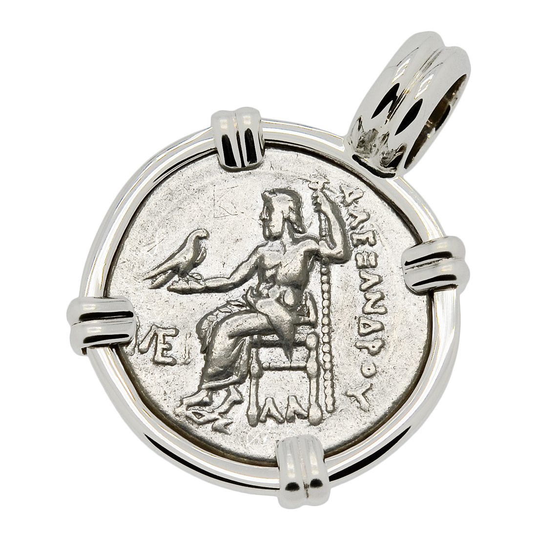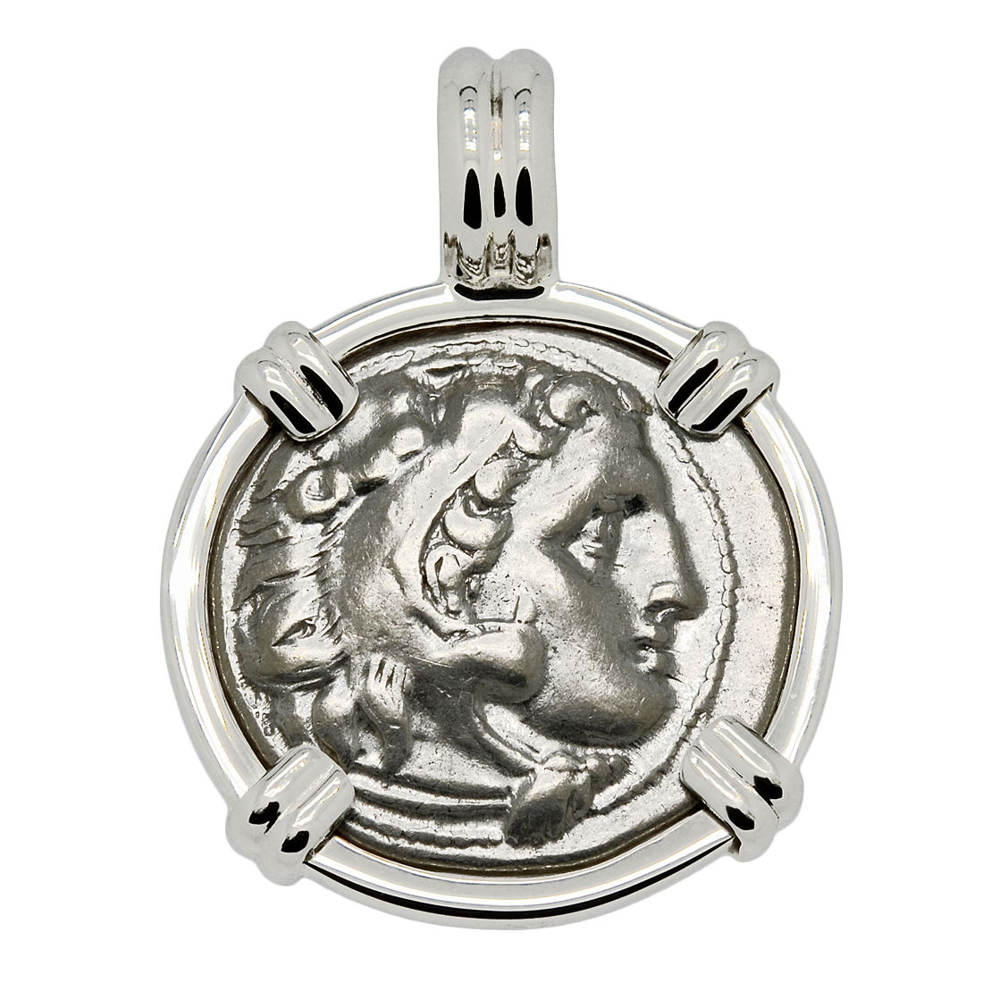 The obverse side of this coin shows the Greek hero Hercules wearing a lion’s skin of armor. This was important to Alexander's hereditary line, as he claimed to be descended from the mythological hero. The reverse shows Zeus, the king of the Greek gods, seated on a throne and holding an eagle with Alexander’s name to the right. Zeus was the most powerful of all the Greek gods and his appearance on Alexander's coinage symbolized Alexander's status as leader of all the Greeks.
