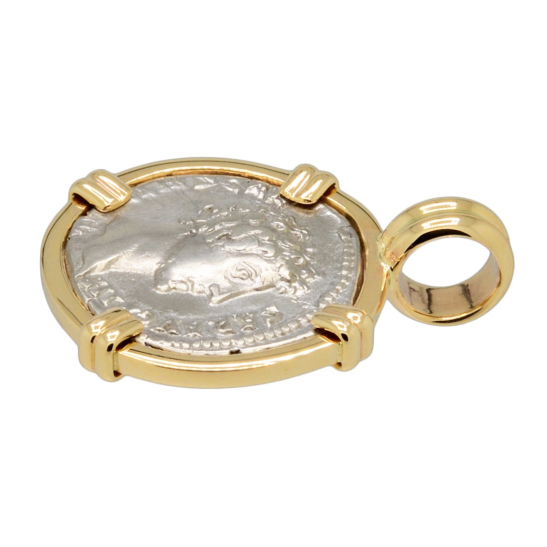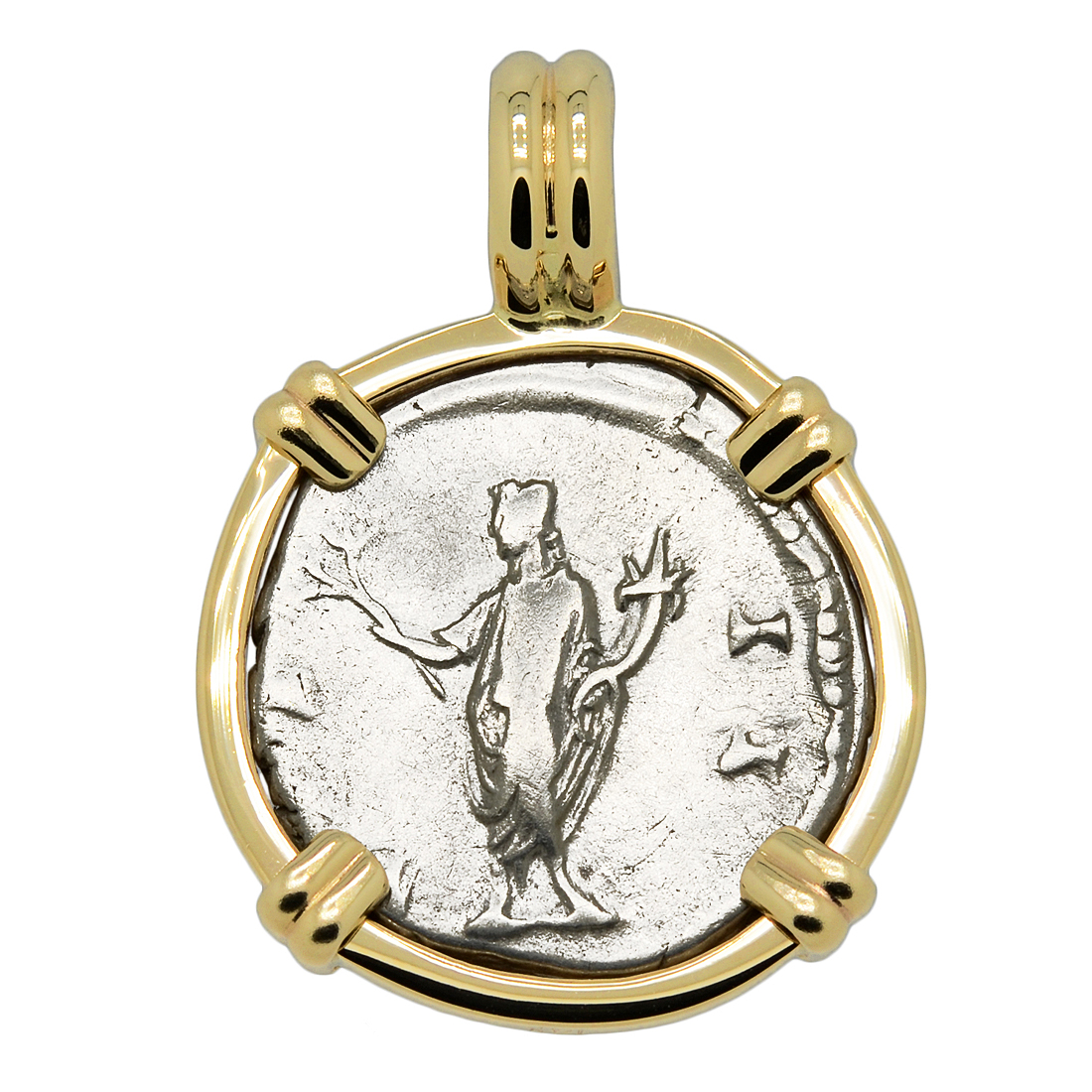The reverse of this denarius coin depicts Honos standing, while holding an olive branch and a cornucopia. Honos was the ancient Roman god of honor and he was worshiped at the Temple of Honor and Virtue in Rome.