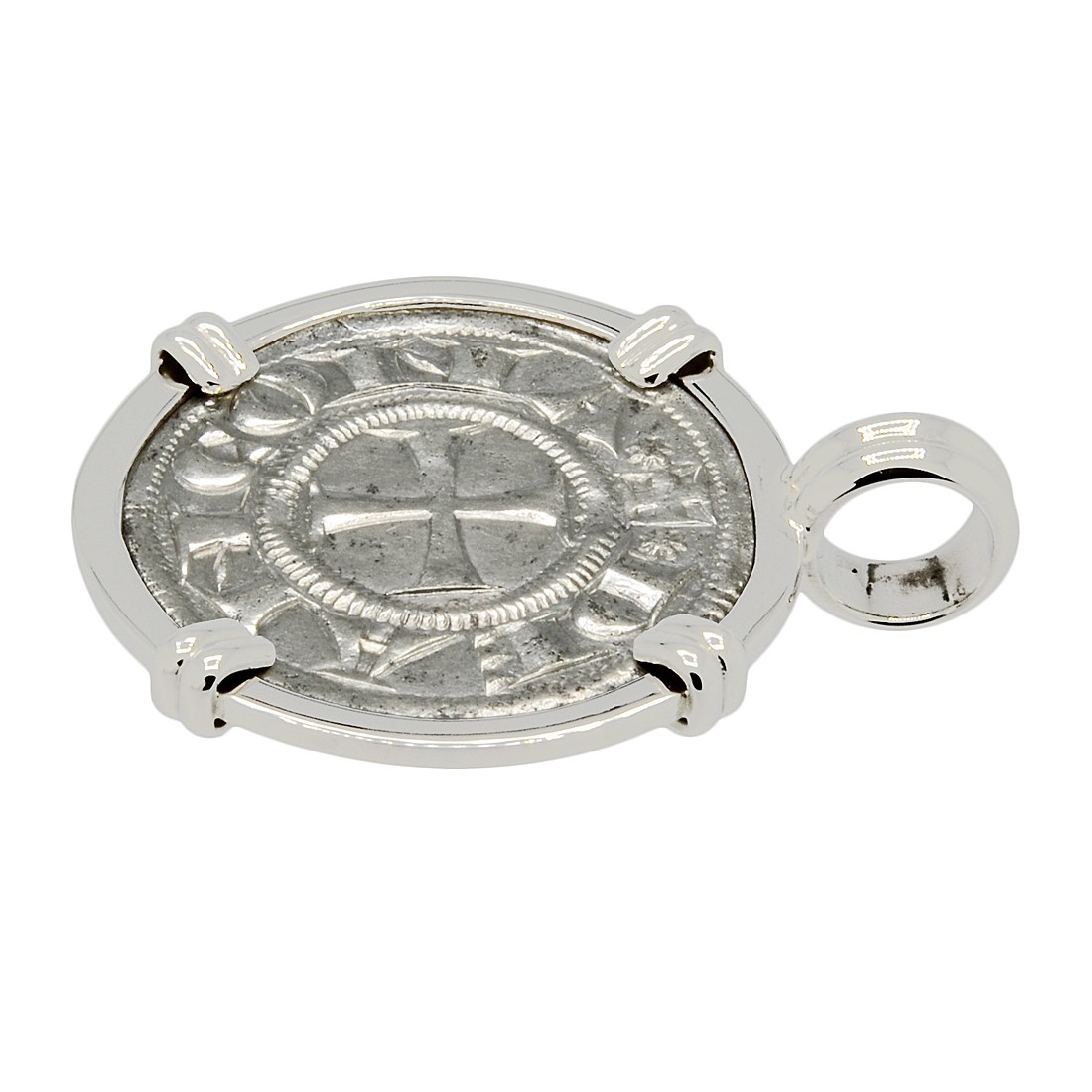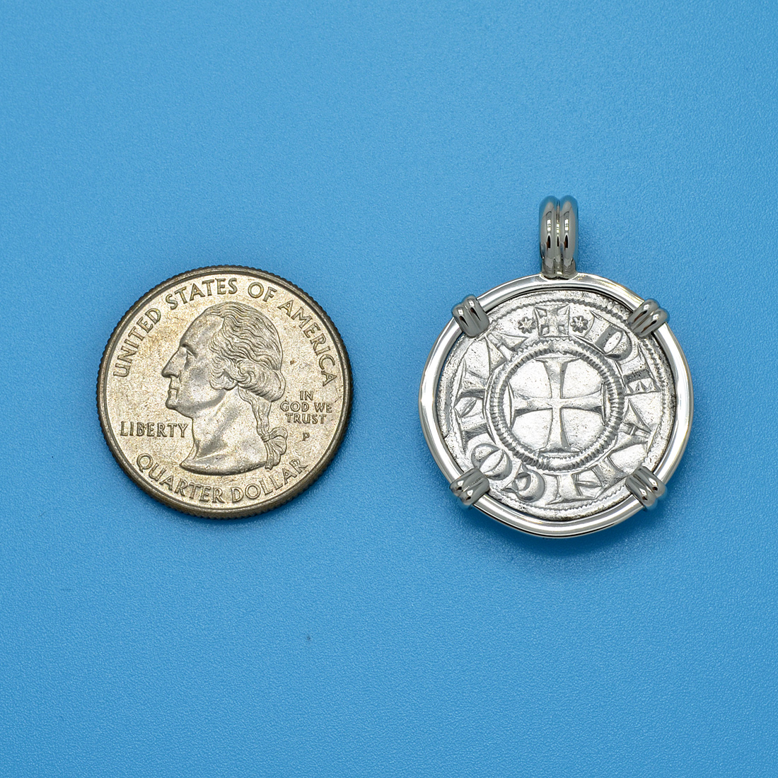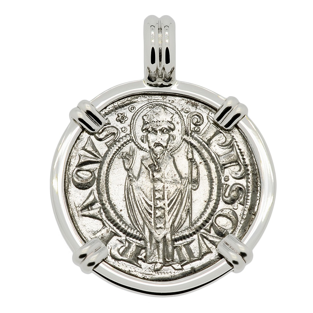 This silver grosso agontano coin was minted in Ancona during the late 13th to early 14th century. The observe side shows a cross pattée with the Latin inscription DE ANCONA translated to “From Ancona.” The reverse shows Saint Judas Cyriacus, the patron saint of Ancona, blessing with his right hand and holding a crosier in his left hand with the coin legend P.P.S. QVIRIACUS “Saint Cyriacus Haloed and Blessing.” Judas Cyracius assisted Saint Helena in discovering the true cross in a pilgrimage to the Holy Land where he was martyred during the 4th century. Today, his remains still lay in the Ancona Cathedral.