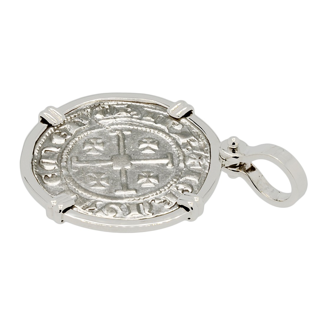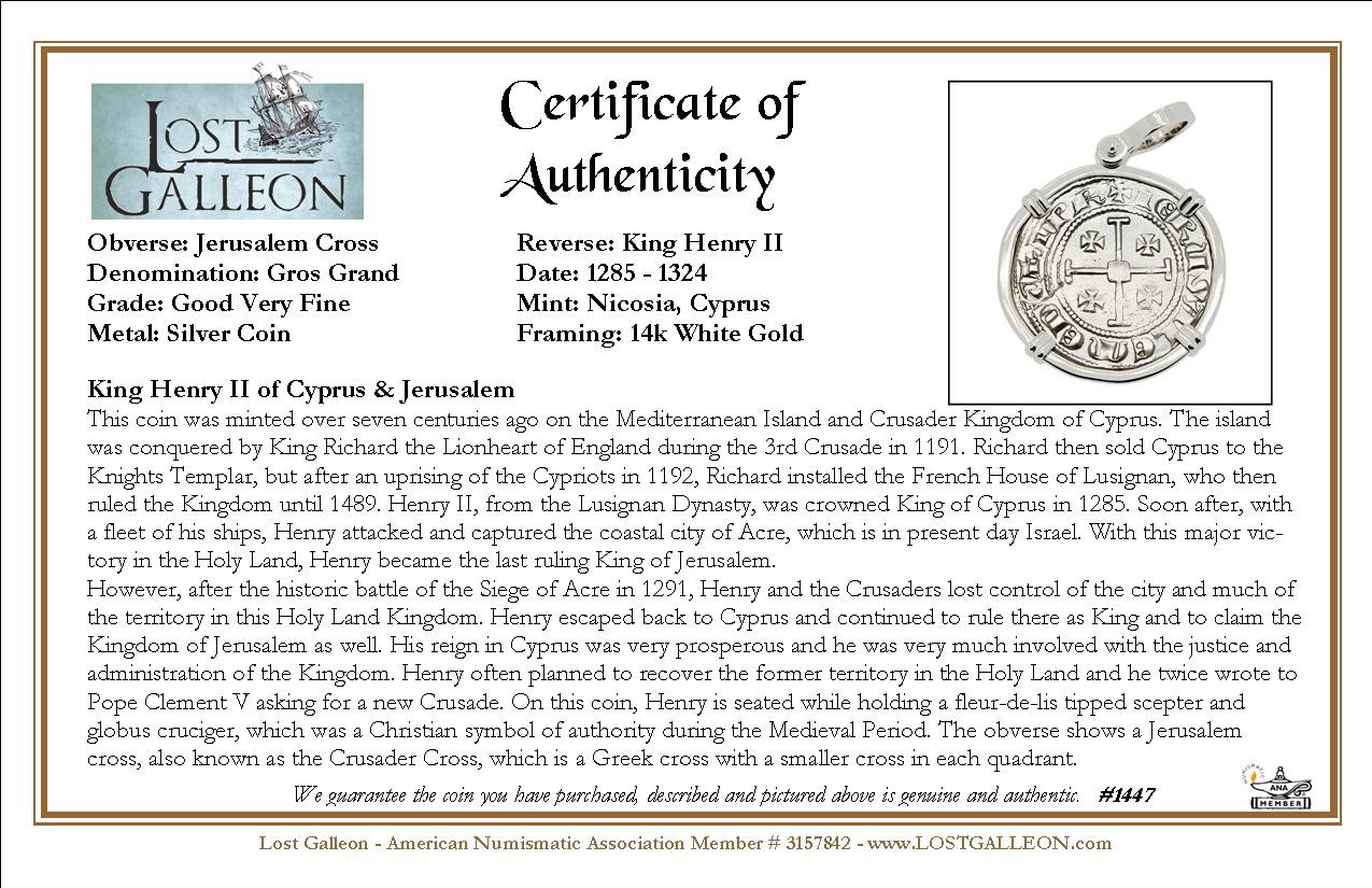 This coin was minted over seven centuries ago on the Mediterranean Island and Crusader Kingdom of Cyprus. The island was conquered by King Richard the Lionheart of England during the 3rd Crusade in 1191. Richard then sold Cyprus to the Knights Templar, but after an uprising of the Cypriots in 1192, Richard installed the French House of Lusignan, who then ruled the Kingdom until 1489. Henry II, from the Lusignan Dynasty, was crowned King of Cyprus in 1285. Soon after, with a fleet of his ships, Henry attacked and captured the coastal city of Acre, which is in present day Israel. With this major victory in the Holy Land, Henry became the last ruling King of Jerusalem.