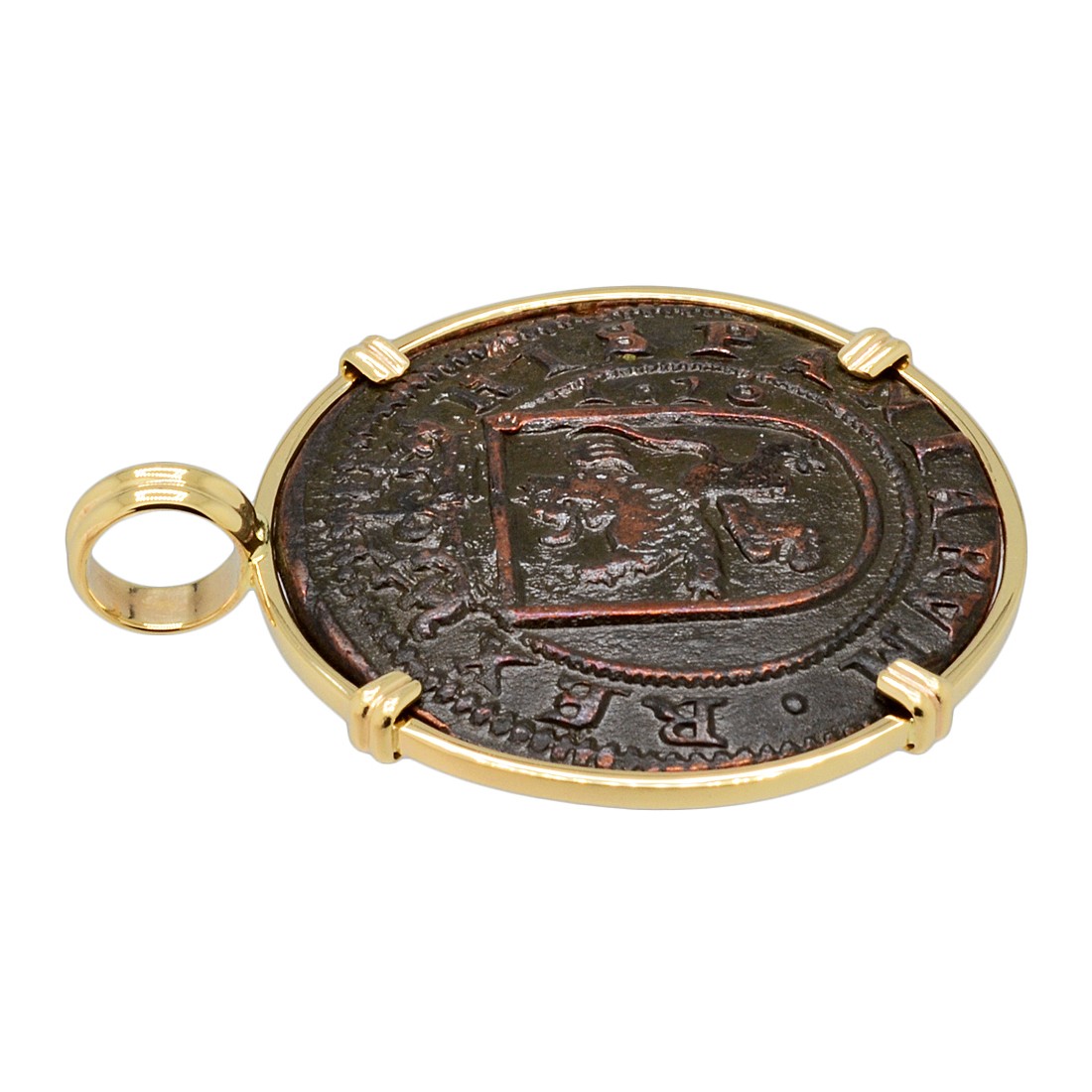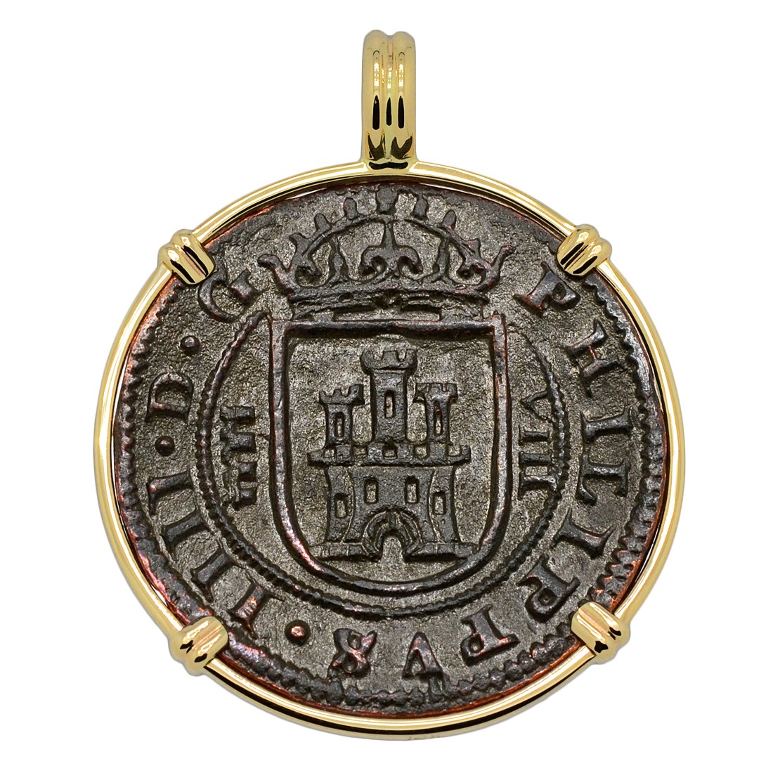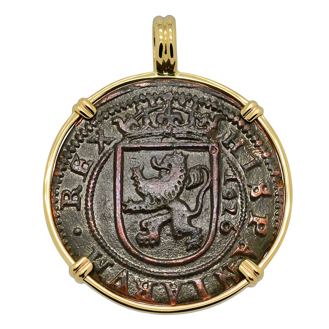 So the Spanish minted the copper maravedi in denominations of 8, 4, 2, and 1, which were valued at 34 maravedis equal to one silver real. A typical sailor was paid around 1,000 maravedis per month. This Spanish coin circulated during the 17th century and is a one-of-a-kind surviving treasure from this this adventurous age.