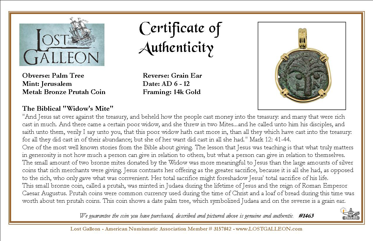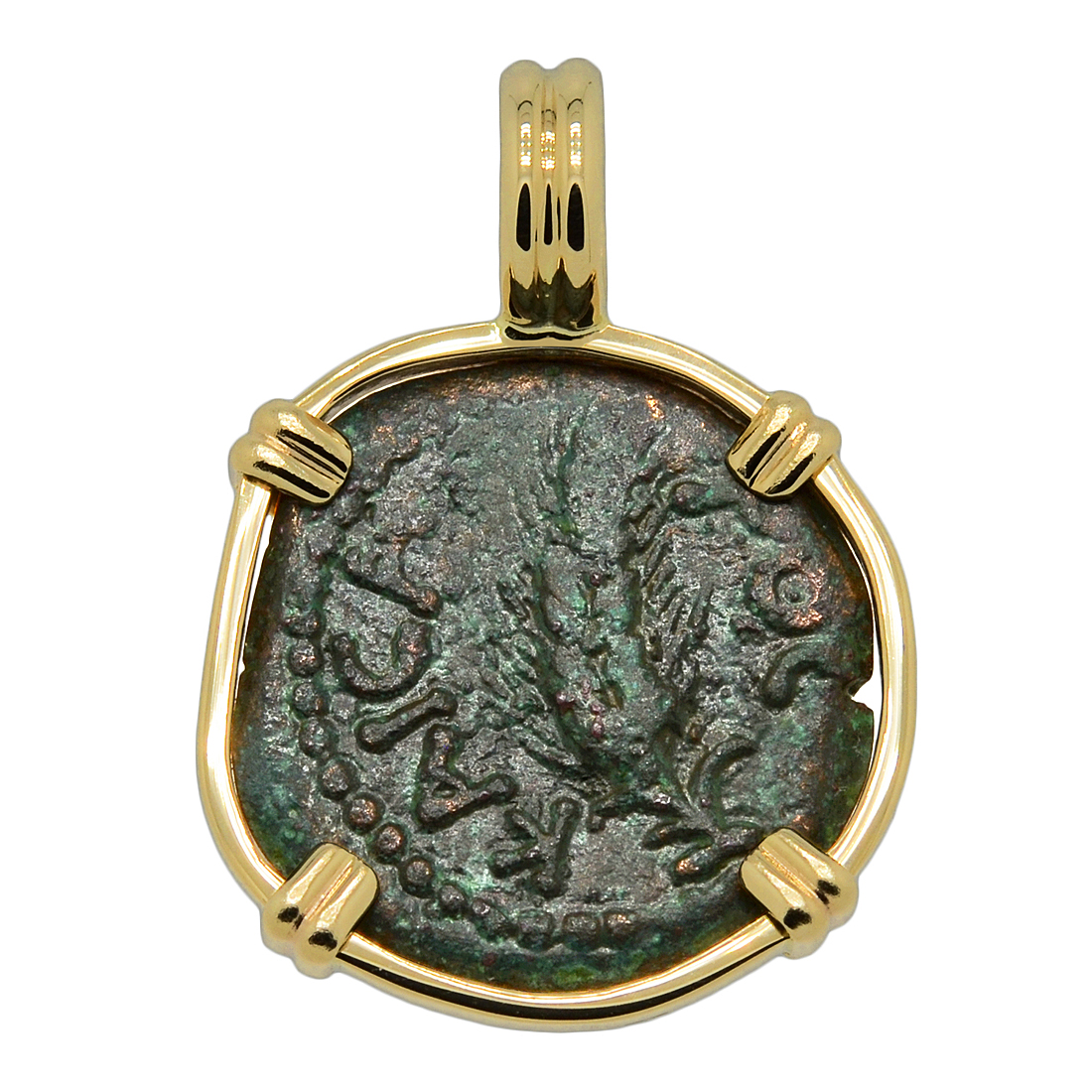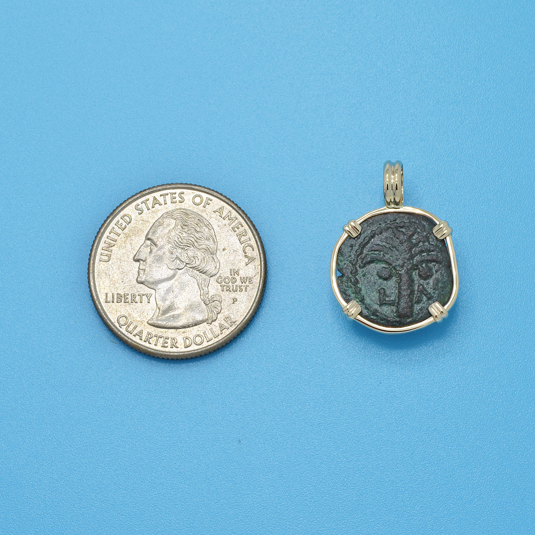 This small bronze coin, called a prutah, was minted in Judaea during the lifetime of Jesus and the reign of Roman Emperor Caesar Augustus. Prutah coins were common currency used during the time of Christ and a loaf of bread during this time was worth about ten prutah coins. This coin shows a date palm tree, which symbolized Judaea and on the reverse is a grain ear.