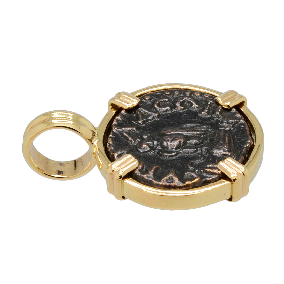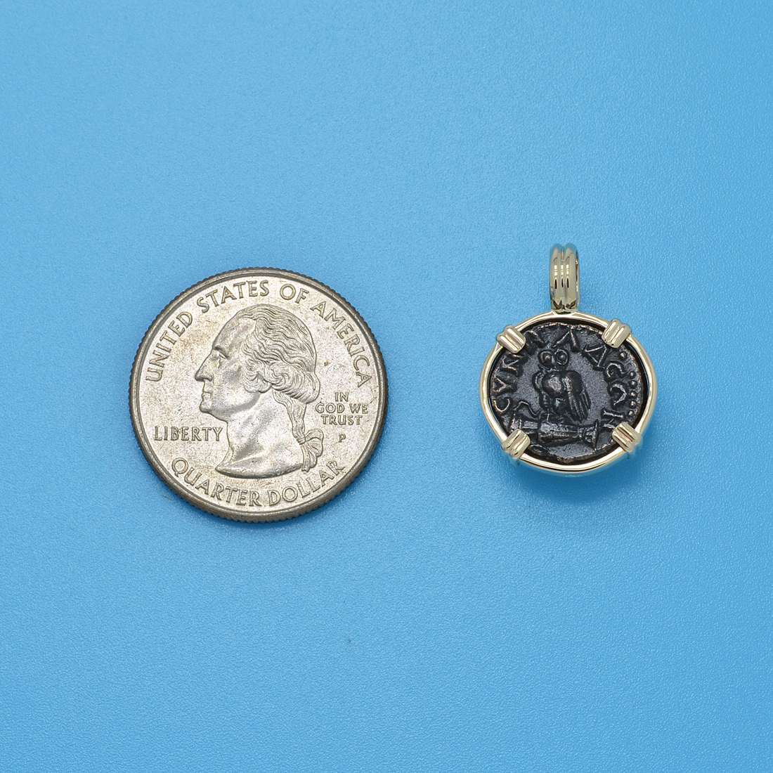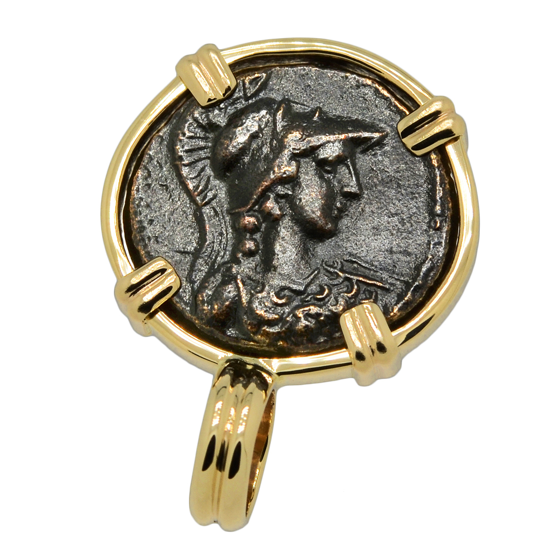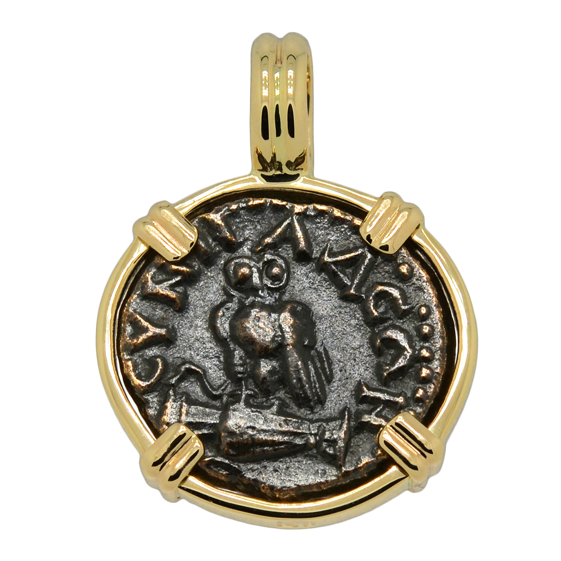 The reverse side of this 2nd century coin from Synnada depicts Athena wearing a crested attic helmet and an aegis. In Greek mythology, Athena was the favorite child of the king of the gods Zeus and was born full-grown and armored from his forehead. Athena became the goddess of wisdom, peace, warfare, strategy and reason. Her gifts to man were the inventions of the plow and the flute, the arts of taming animals, building ships along with making shoes. An armed warrior goddess, Athena appears in Greek mythology as a helper of many heroes, including Odysseus, Jason and Hercules. Athena was associated with birds and was often attended by her wise owl, which is featured on the obverse side of this coin standing on an overturned amphora.