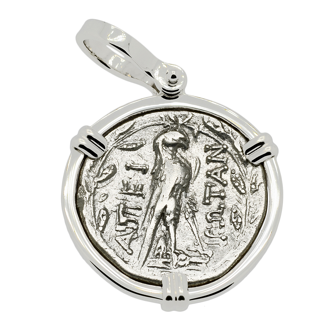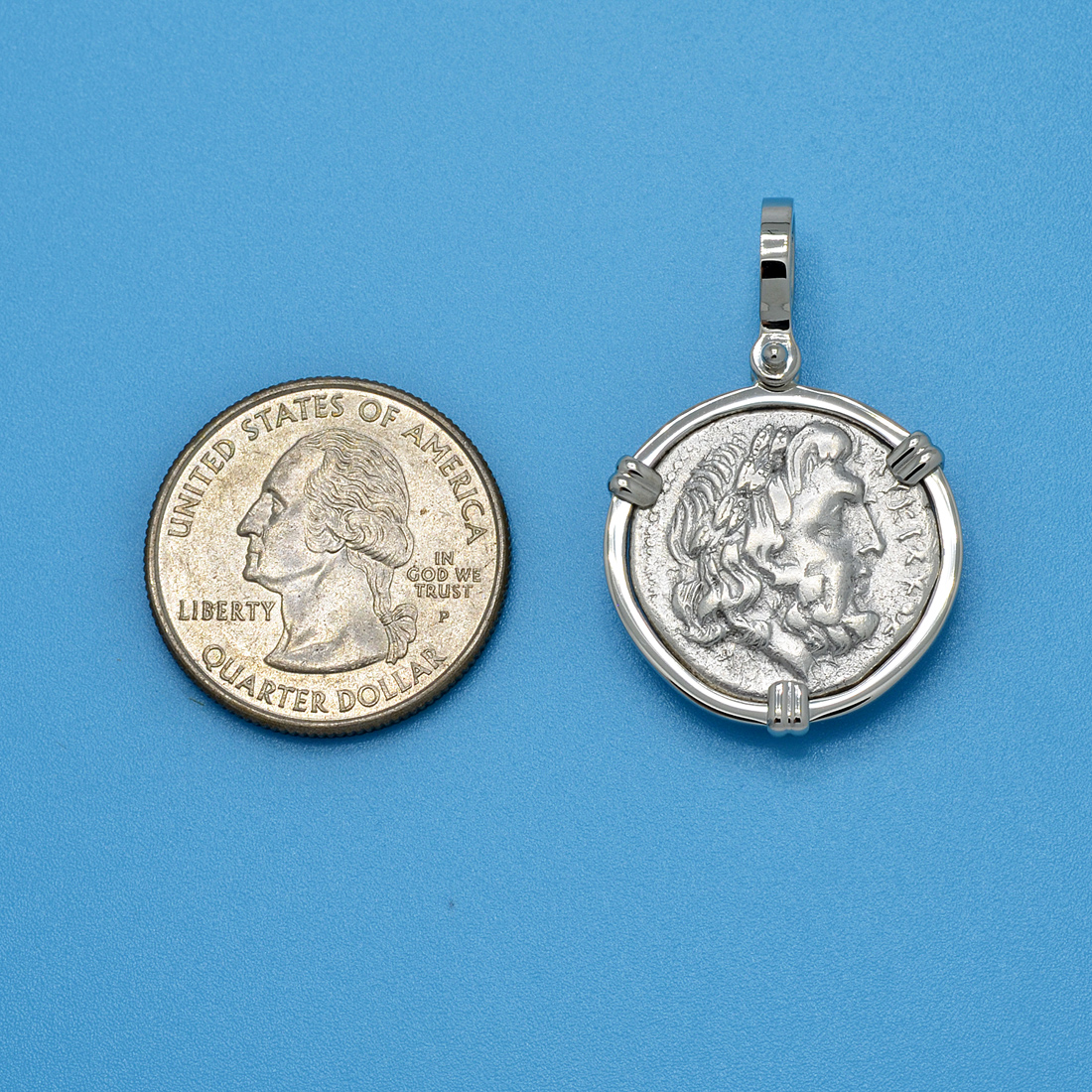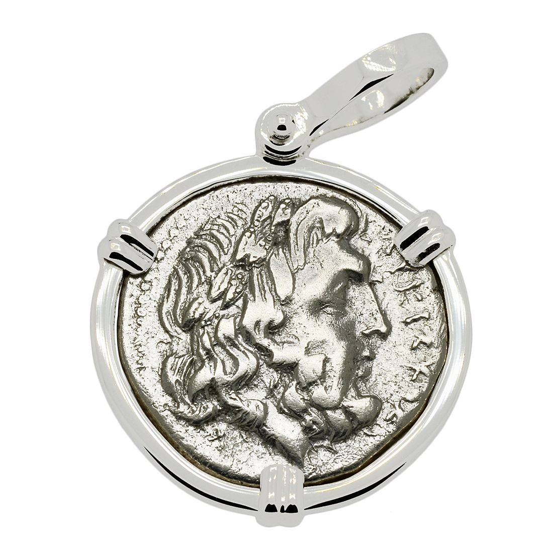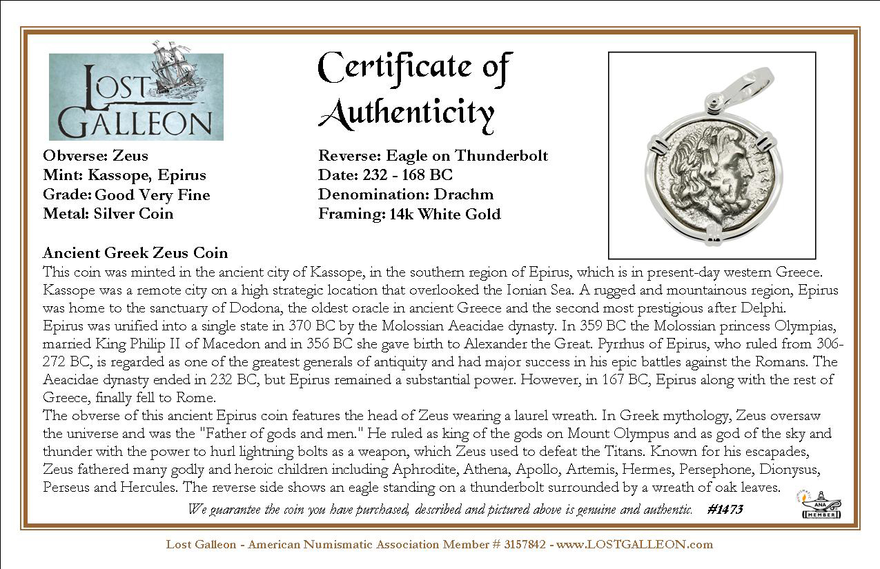 The obverse of this ancient Epirus coin features the head of Zeus wearing a laurel wreath. In Greek mythology, Zeus oversaw the universe and was the "Father of gods and men." He ruled as king of the gods on Mount Olympus and as god of the sky and thunder with the power to hurl lightning bolts as a weapon, which Zeus used to defeat the Titans. Known for his escapades, Zeus fathered many godly and heroic children including Aphrodite, Athena, Apollo, Artemis, Hermes, Persephone, Dionysus, Perseus and Hercules. The reverse side shows an eagle standing on a thunderbolt surrounded by a wreath of oak leaves.