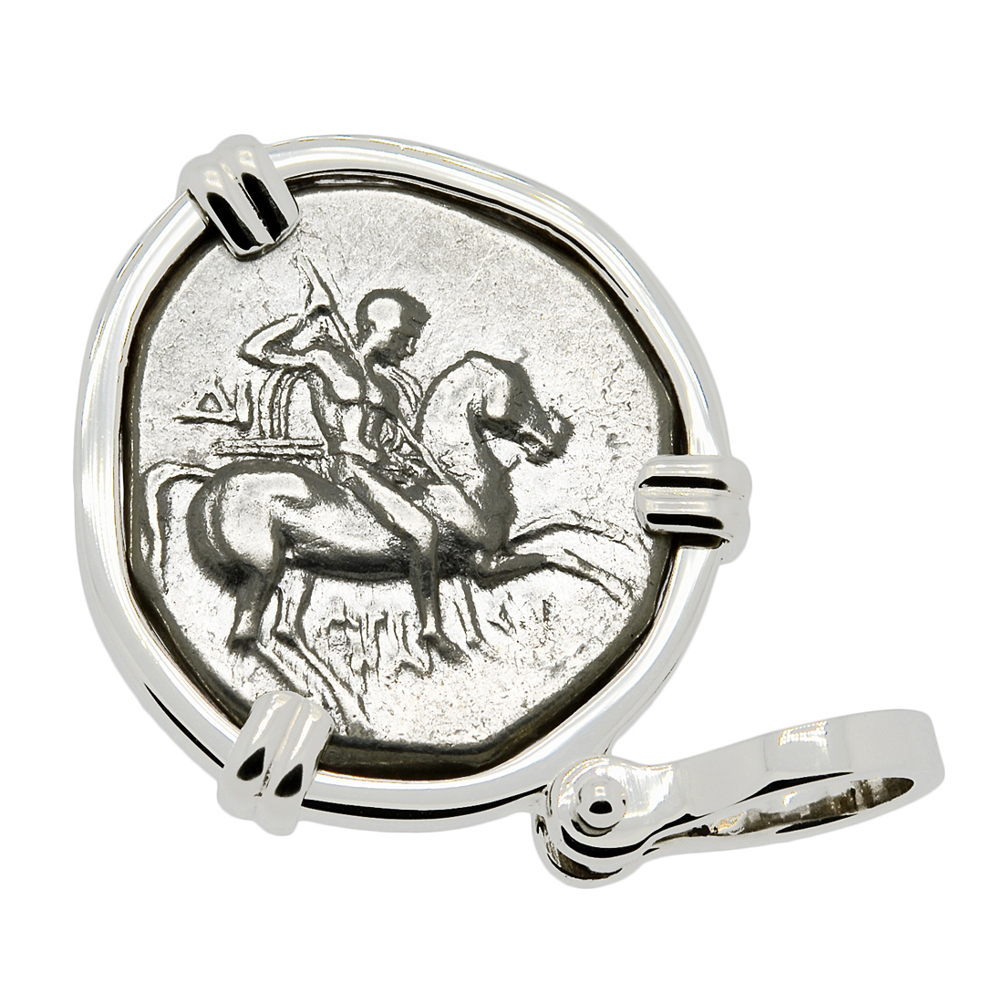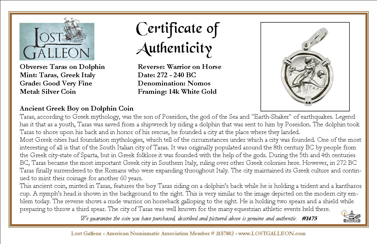 This ancient coin, minted in Taras, features the boy Taras riding on a dolphin’s back while he is holding a trident and a kantharos cup. A nymph’s head is shown in the background to the right. This is very similar to the image depicted on the modern city emblem today. The reverse shows a nude warrior on horseback galloping to the right. He is holding two spears and a shield while preparing to throw a third spear. The city of Taras was well known for the many equestrian athletic events held there.