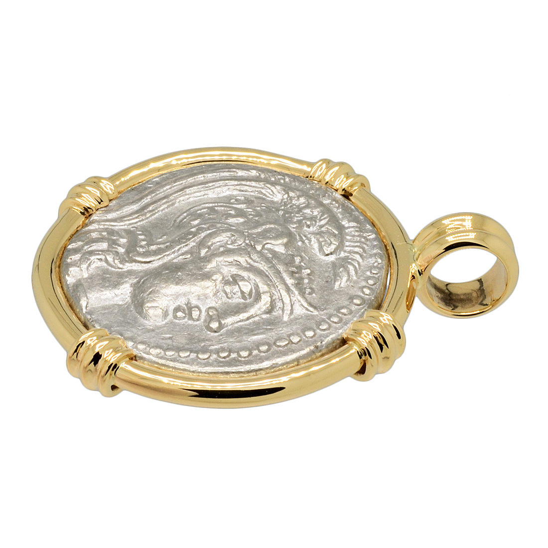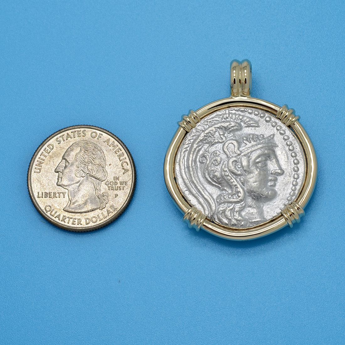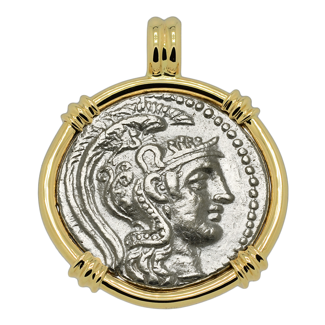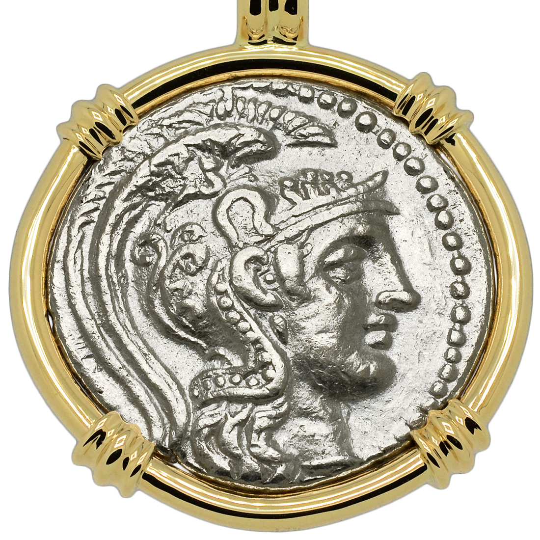 This ancient coin features the head of Athena, wearing a triple-crested Attic helmet decorated with four horses above the visor and Pegasus in flight above the raised earpiece. In Greek mythology, Athena was the goddess of wisdom, peace, warfare, strategy and reason. Her gifts to man were the inventions of the plow and the flute, the arts of taming animals, building ships along with making shoes. An armed warrior goddess, Athena appears in Greek mythology as a helper of many heroes, including Odysseus, Jason and Hercules. She never consorts with a lover, earning the title Athena Parthenos "Athena the Virgin", hence the name of her most famous temple, the Parthenon, on the Acropolis in Athens.