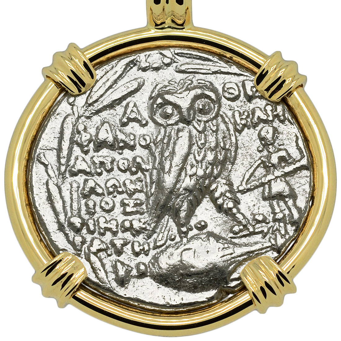 Athena was associated with birds and was often attended by her wise owl. The reverse side of this coin shows her owl standing on an amphora with Artemis holding a torch to the right. To the left are the Athens mint magistrates names Phanokles, Apollonios and Timokrate, all within a wreath.