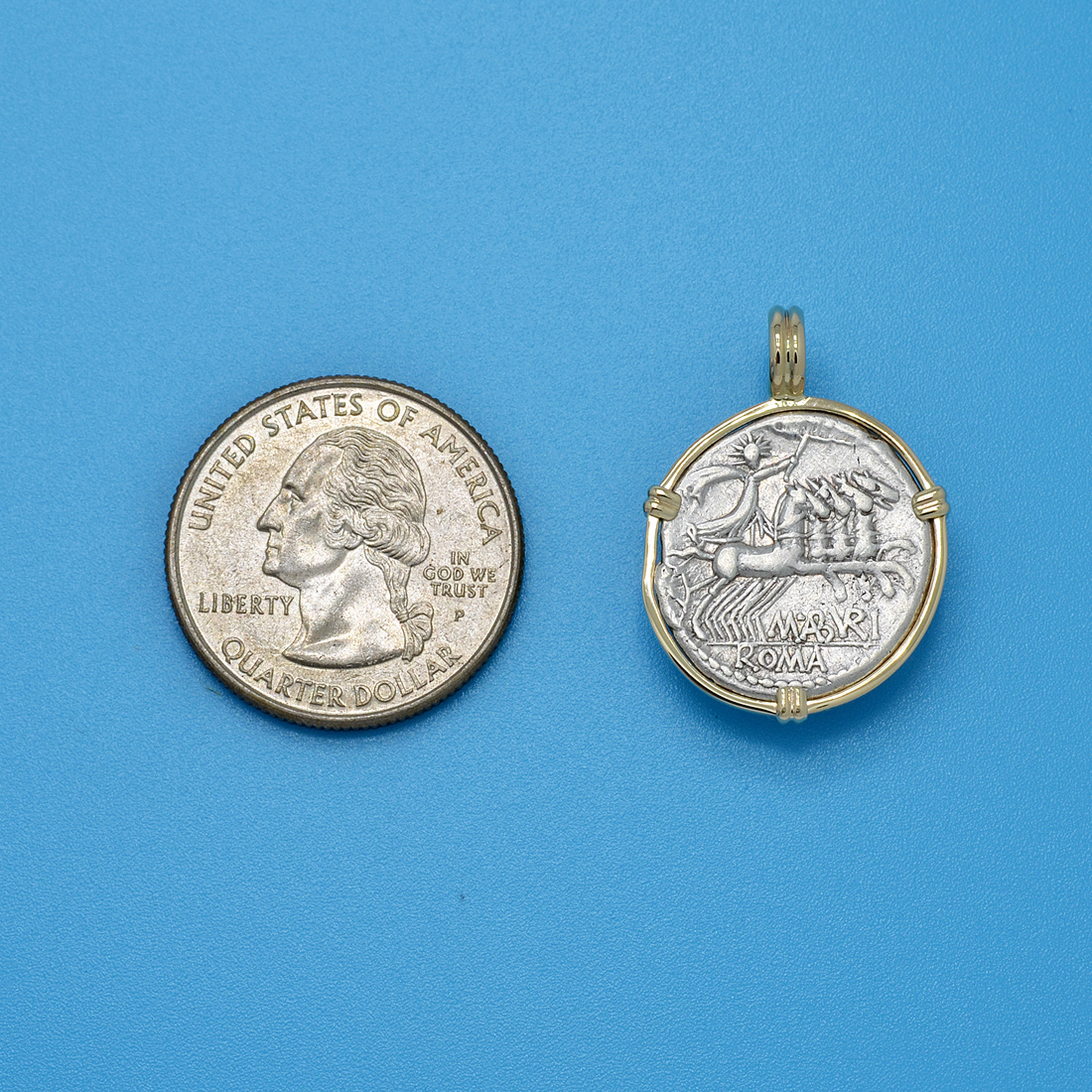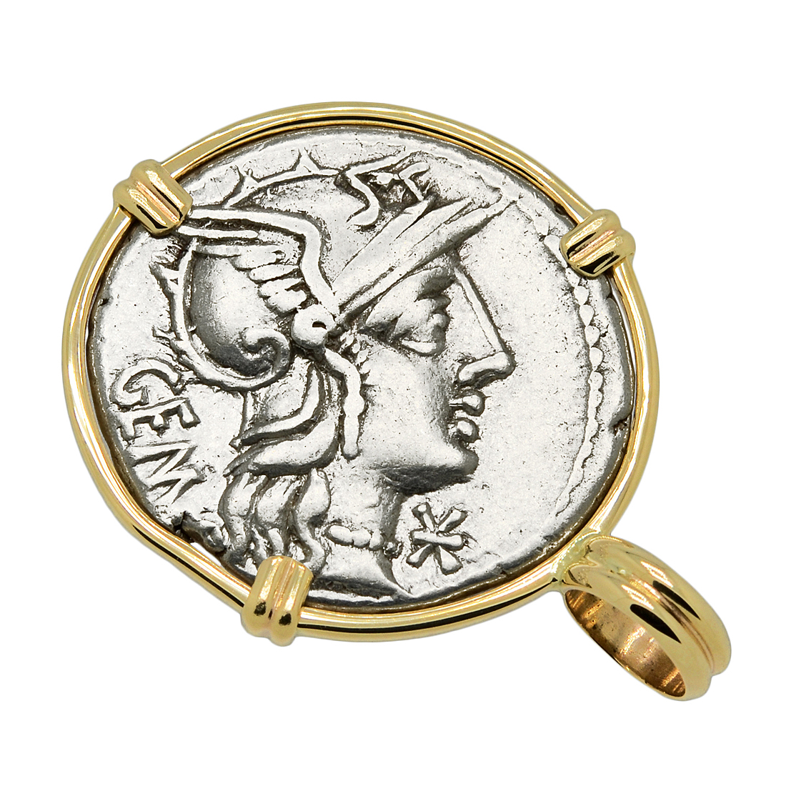 • Silver Denarius Coin in 14k Gold Pendant, Weight 5.05g