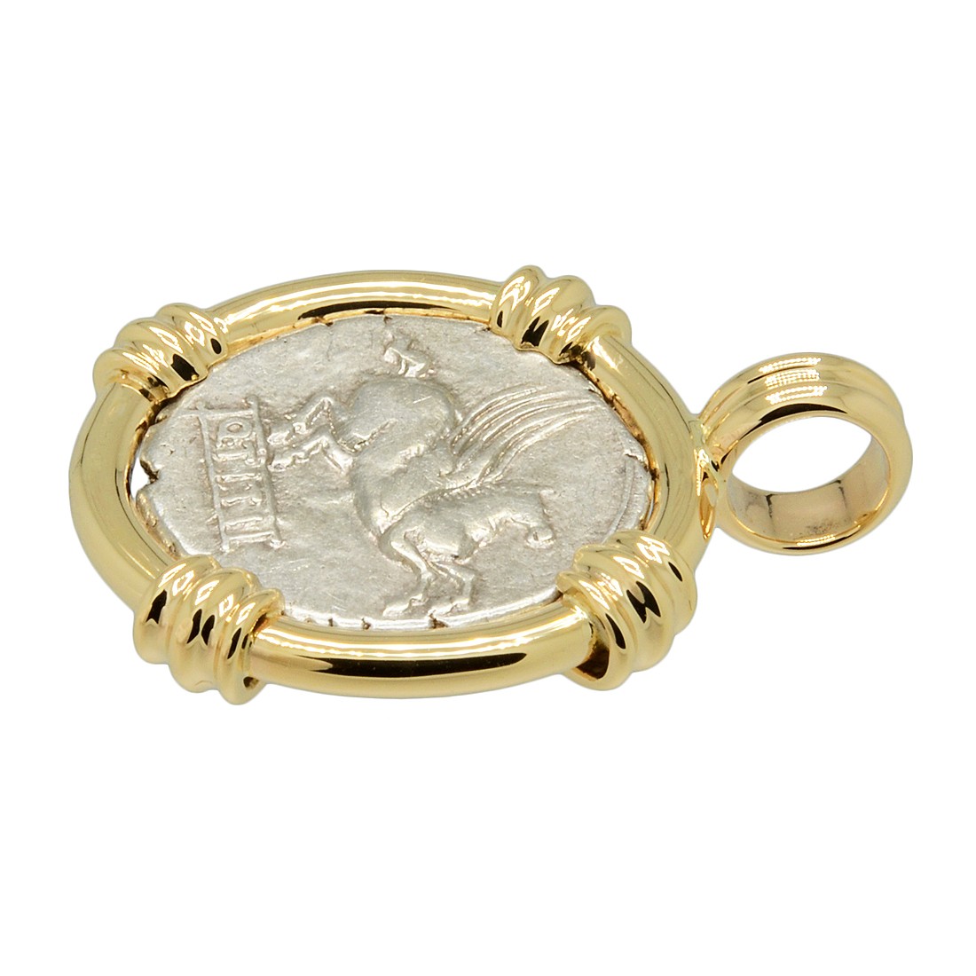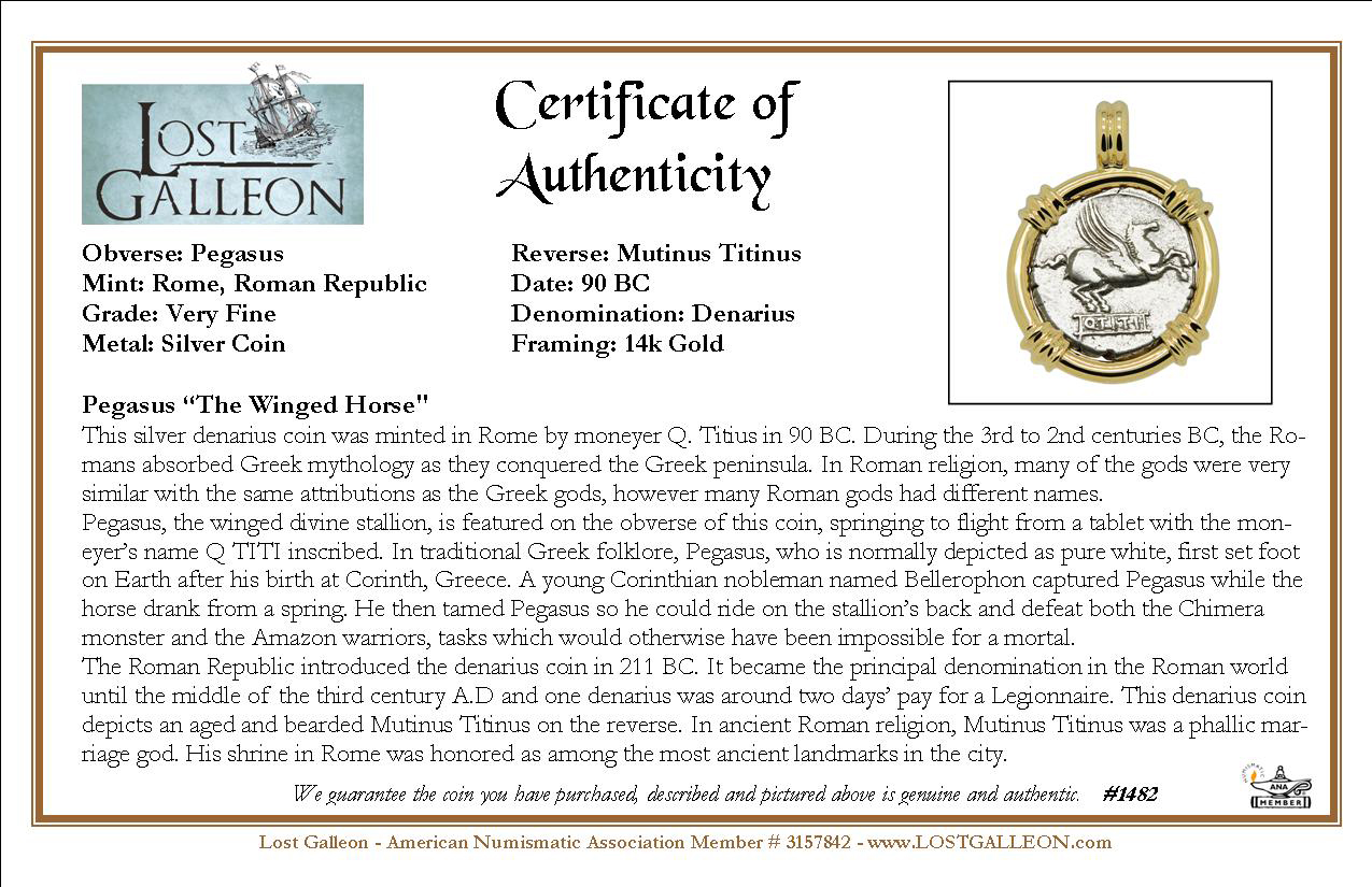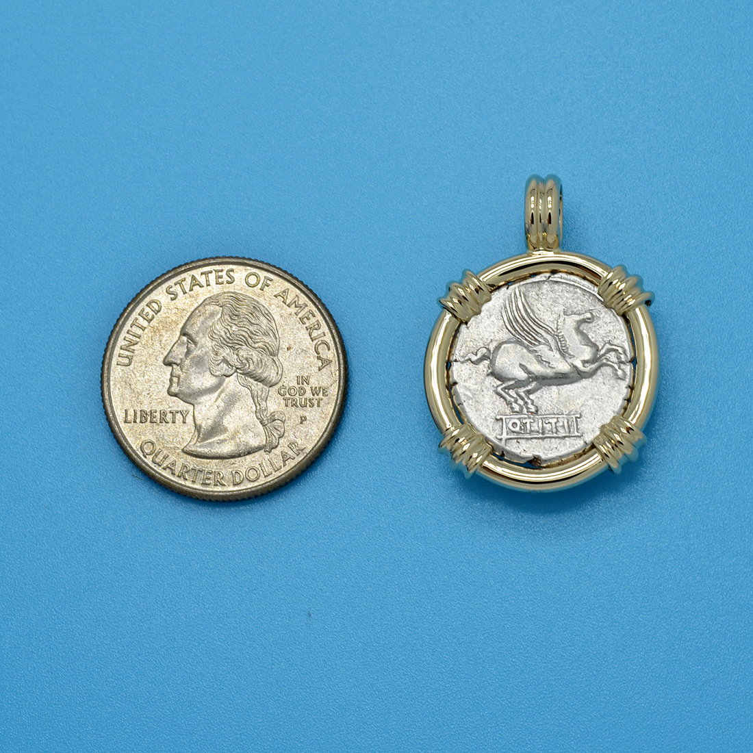 Pegasus, the winged divine stallion, is featured on the obverse of this coin, springing to flight from a tablet with the moneyer’s name Q TITI inscribed. In traditional Greek folklore, Pegasus, who is normally depicted as pure white, first set foot on Earth after his birth at Corinth, Greece. A young Corinthian nobleman named Bellerophon captured Pegasus while the horse drank from a spring. He then tamed Pegasus so he could ride on the stallion’s back and defeat both the Chimera monster and the Amazon warriors, tasks which would otherwise have been impossible for a mortal.