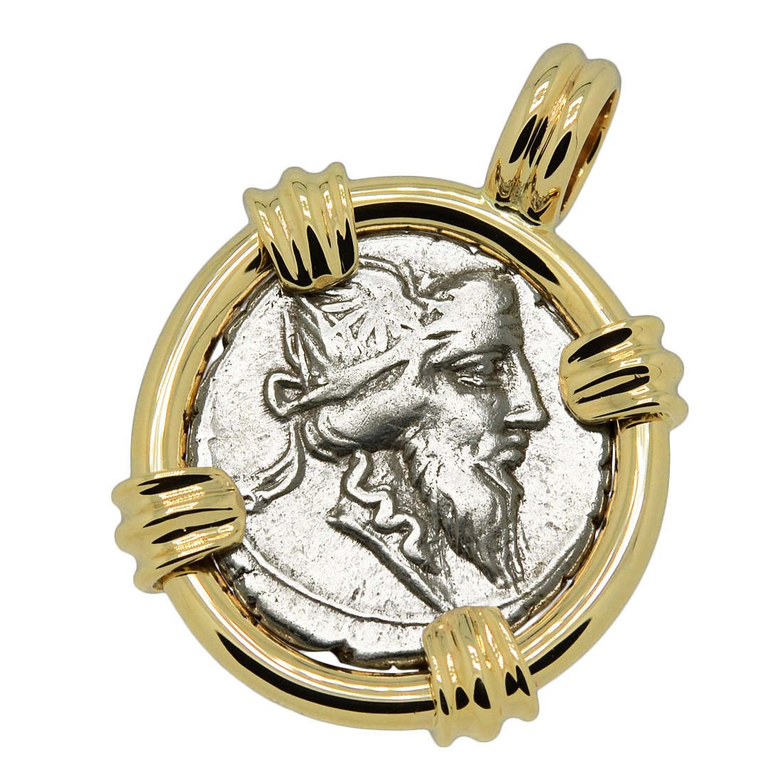 This silver denarius coin was minted in Rome by moneyer Q. Titius in 90 BC. During the 3rd to 2nd centuries BC, the Romans absorbed Greek mythology as they conquered the Greek peninsula. In Roman religion, many of the gods were very similar with the same attributions as the Greek gods, however many Roman gods had different names.