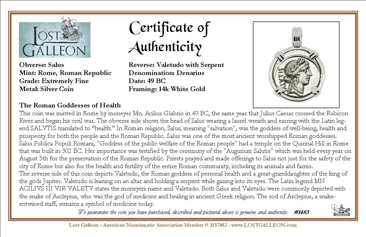 This coin was minted in Rome by moneyer Mn. Acilius Glabrio in 49 BC, the same year that Julius Caesar crossed the Rubicon River and began his civil war. The obverse side shows the head of Salus wearing a laurel wreath and earring with the Latin legend SALVTIS translated to “health.” In Roman religion, Salus, meaning "salvation", was the goddess of well-being, health and prosperity for both the people and the Roman Republic.