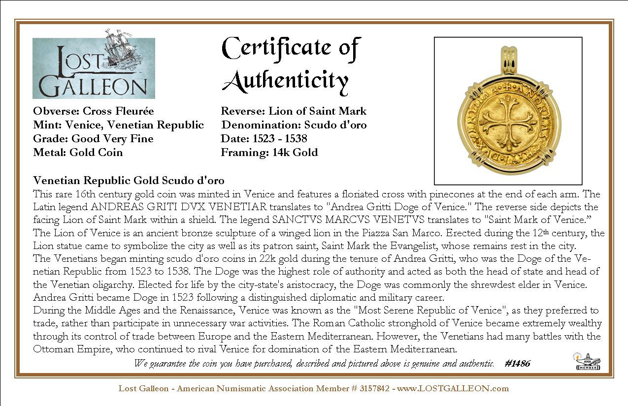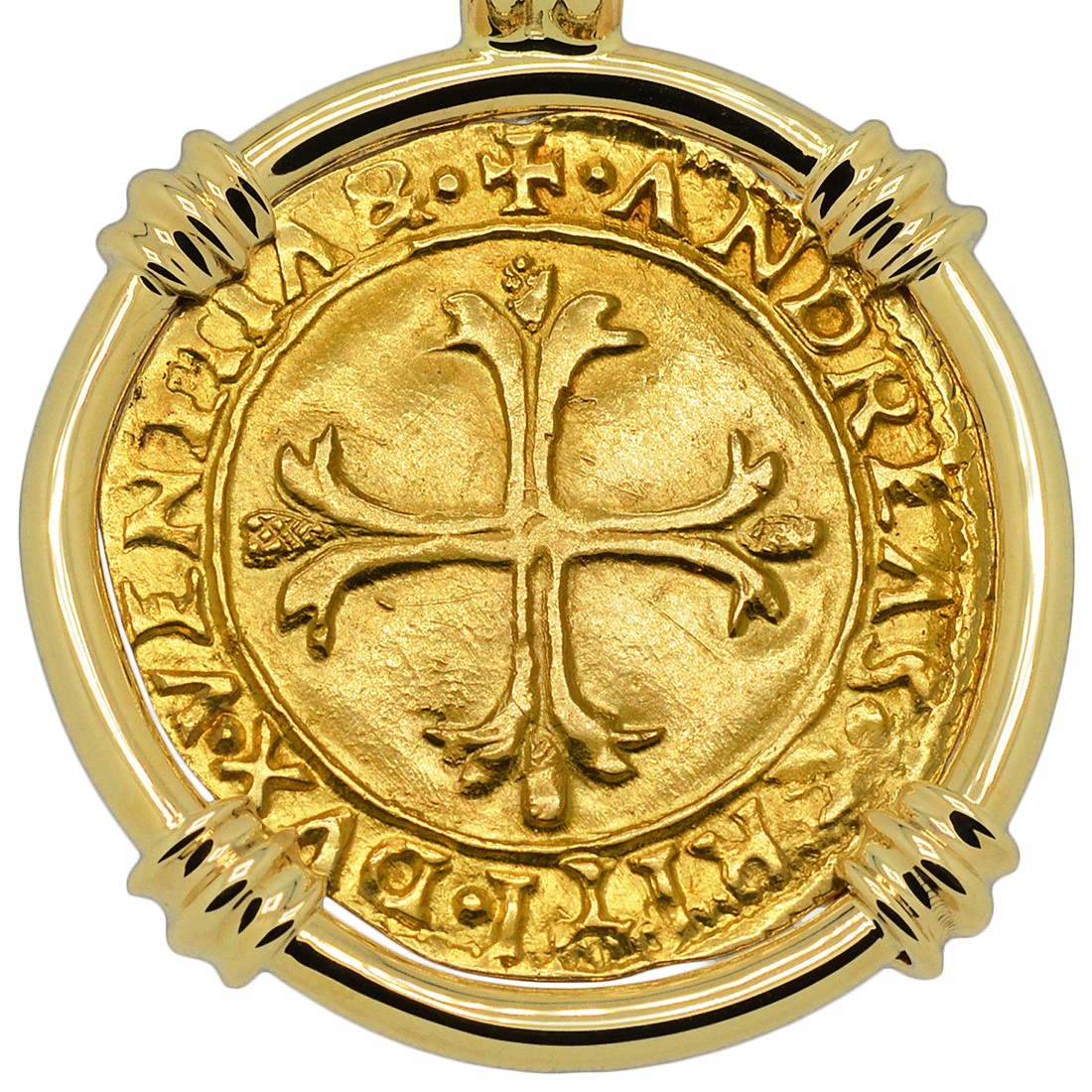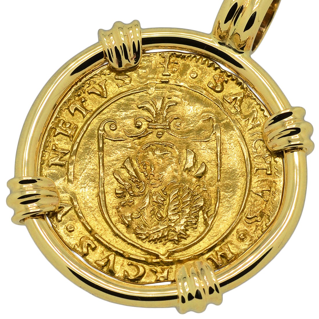 This rare 16th century gold coin was minted in Venice and features a floriated cross with pinecones at the end of each arm. The Latin legend ANDREAS GRITI DVX VENETIAR translates to "Andrea Gritti Doge of Venice." The reverse side depicts the facing Lion of Saint Mark within a shield. The legend SANCTVS MARCVS VENETVS translates to "Saint Mark of Venice.” The Lion of Venice is an ancient bronze sculpture of a winged lion in the Piazza San Marco. Erected during the 12th century, the Lion statue came to symbolize the city as well as its patron saint, Saint Mark the Evangelist, whose remains rest in the city.