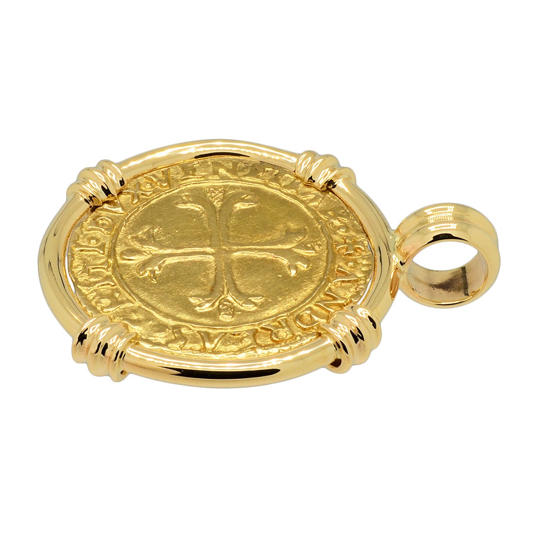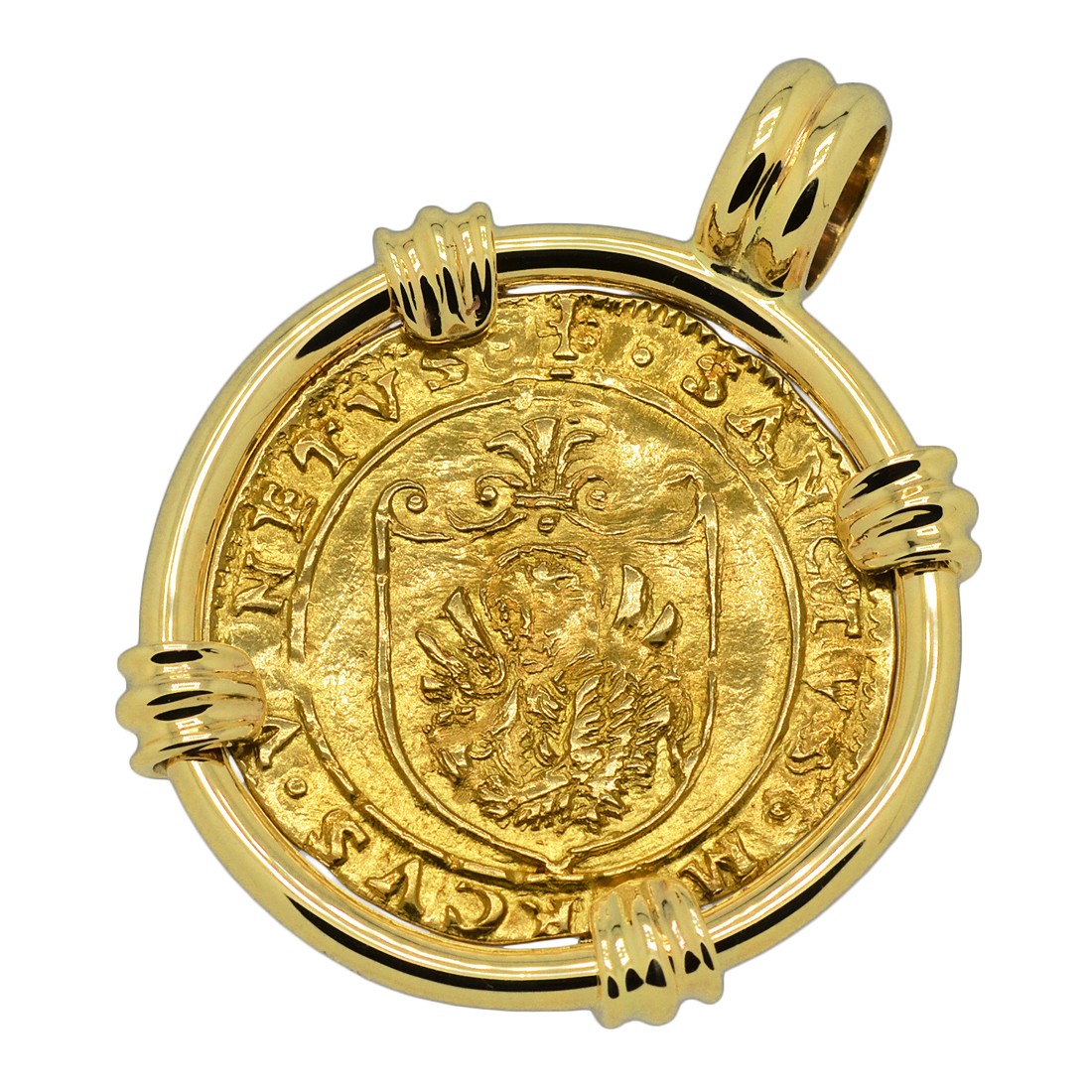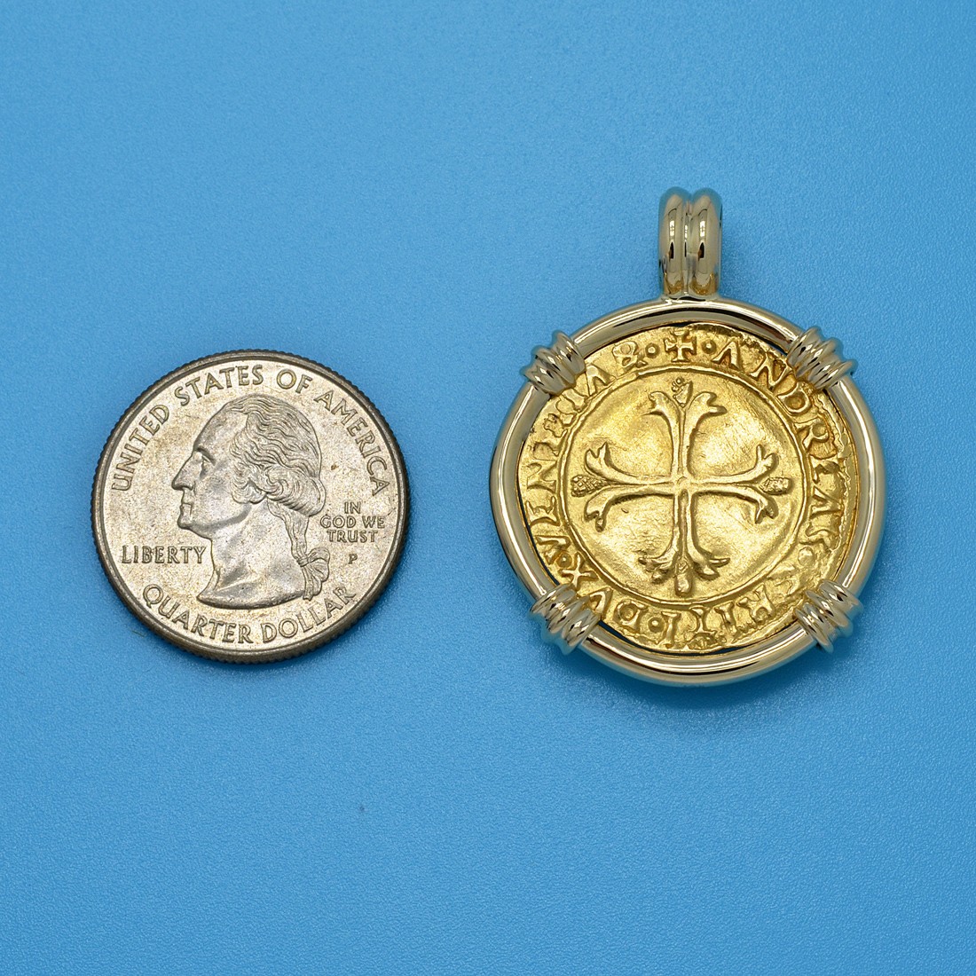 This rare 16th century gold coin was minted in Venice and features a floriated cross with pinecones at the end of each arm. The Latin legend ANDREAS GRITI DVX VENETIAR translates to "Andrea Gritti Doge of Venice." The reverse side depicts the facing Lion of Saint Mark within a shield. The legend SANCTVS MARCVS VENETVS translates to "Saint Mark of Venice.” The Lion of Venice is an ancient bronze sculpture of a winged lion in the Piazza San Marco. Erected during the 12th century, the Lion statue came to symbolize the city as well as its patron saint, Saint Mark the Evangelist, whose remains rest in the city.