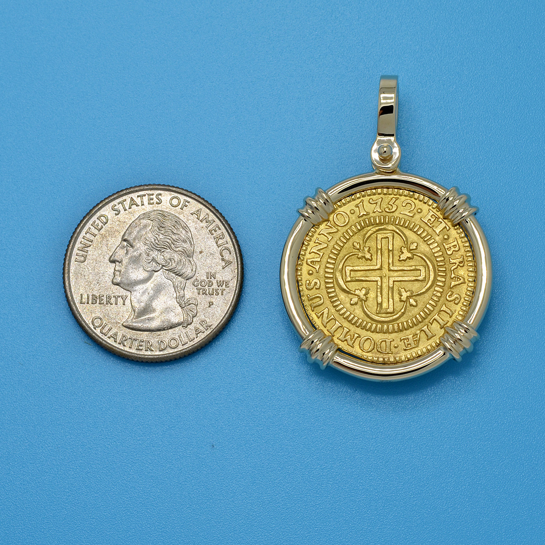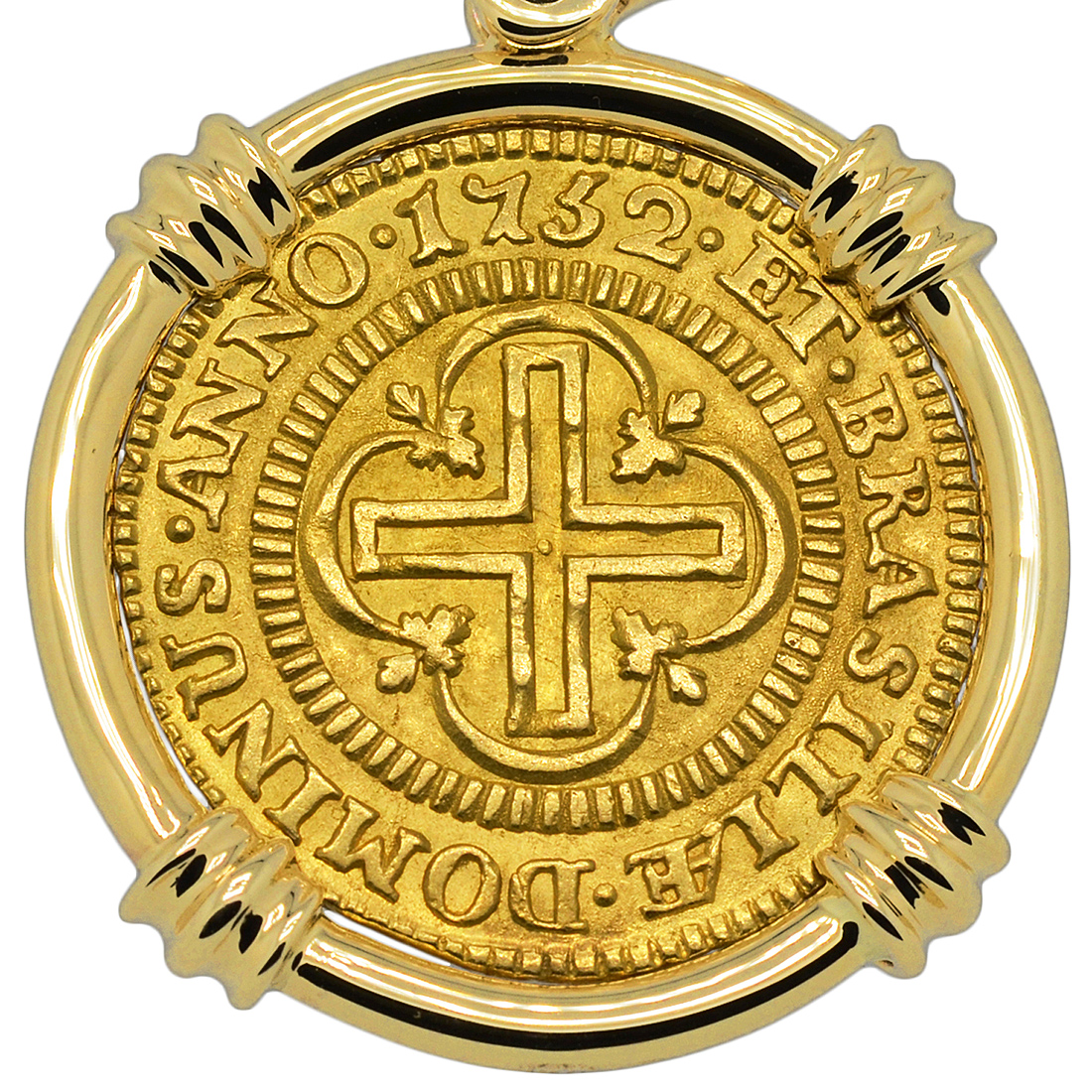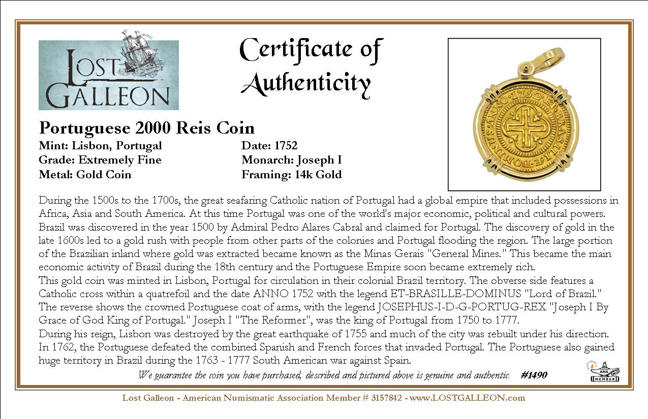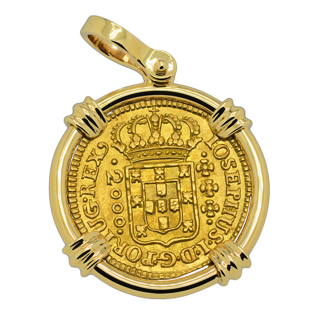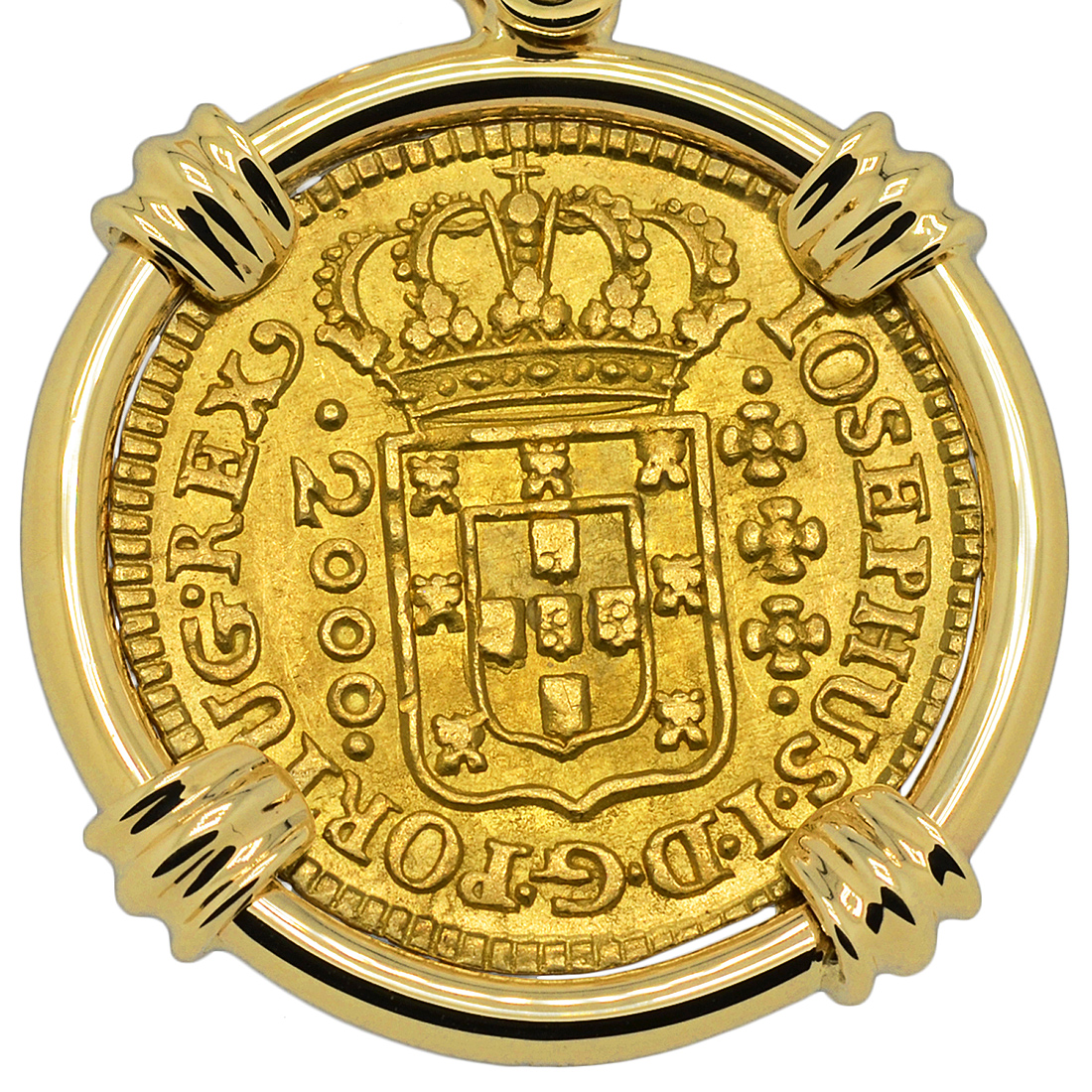 This gold coin was minted in Lisbon, Portugal for circulation in their colonial Brazil territory. The obverse side features a Catholic cross within a quatrefoil and the date ANNO 1752 with the legend ET-BRASILLE-DOMINUS "Lord of Brazil." The reverse shows the crowned Portuguese coat of arms, with the legend JOSEPHUS-I-D-G-PORTUG-REX "Joseph I By Grace of God King of Portugal." Joseph I "The Reformer", was the king of Portugal from 1750 to 1777.