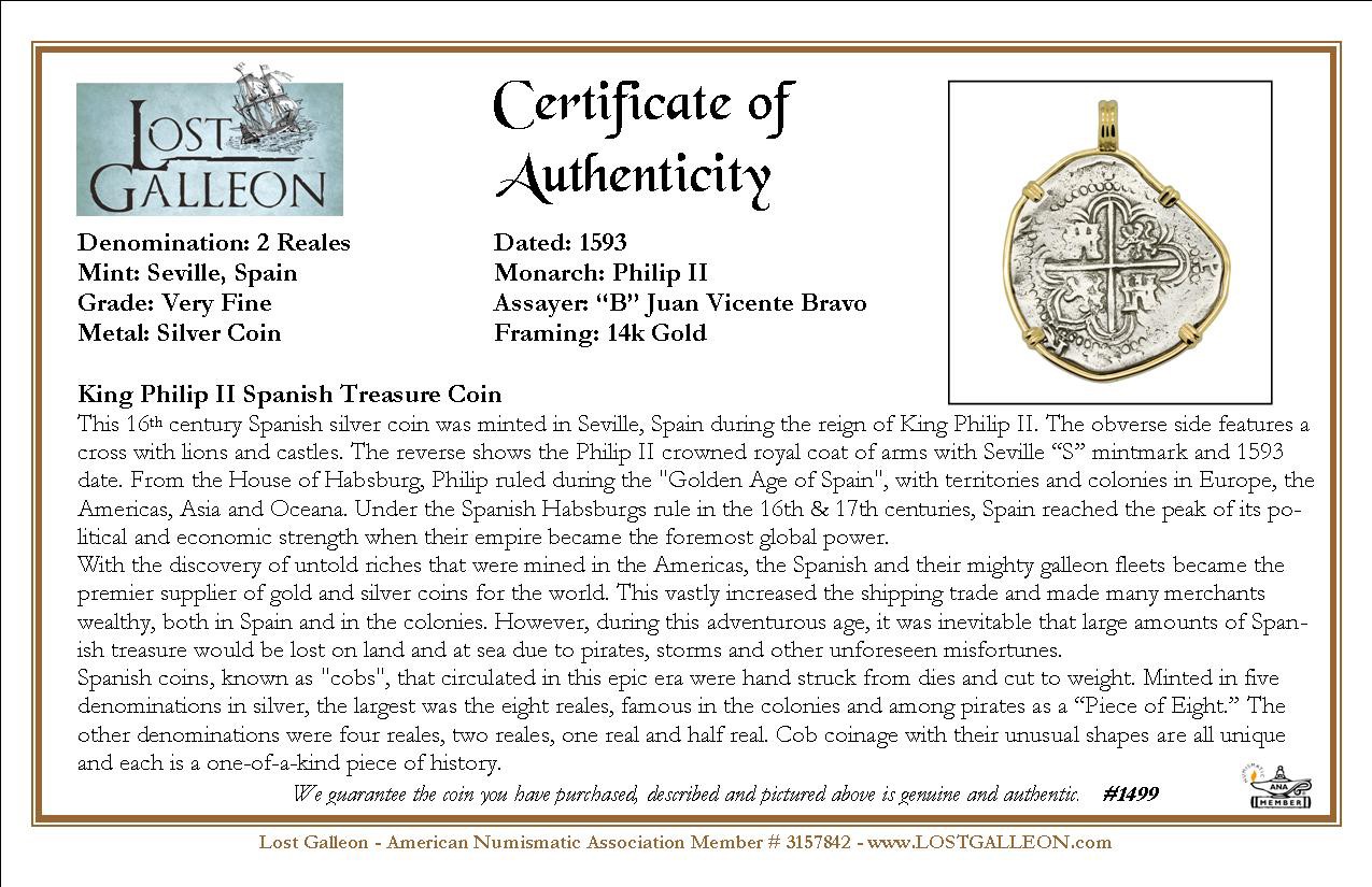 This 16th century Spanish silver coin was minted in Seville, Spain during the reign of King Philip II. The obverse side features a cross with lions and castles. The reverse shows the Philip II crowned royal coat of arms with Seville “S” mintmark and 1593 date. From the House of Habsburg, Philip ruled during the "Golden Age of Spain", with territories and colonies in Europe, the Americas, Asia and Oceana. Under the Spanish Habsburgs rule in the 16th & 17th centuries, Spain reached the peak of its political and economic strength when their empire became the foremost global power.
