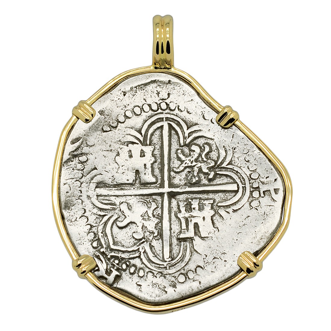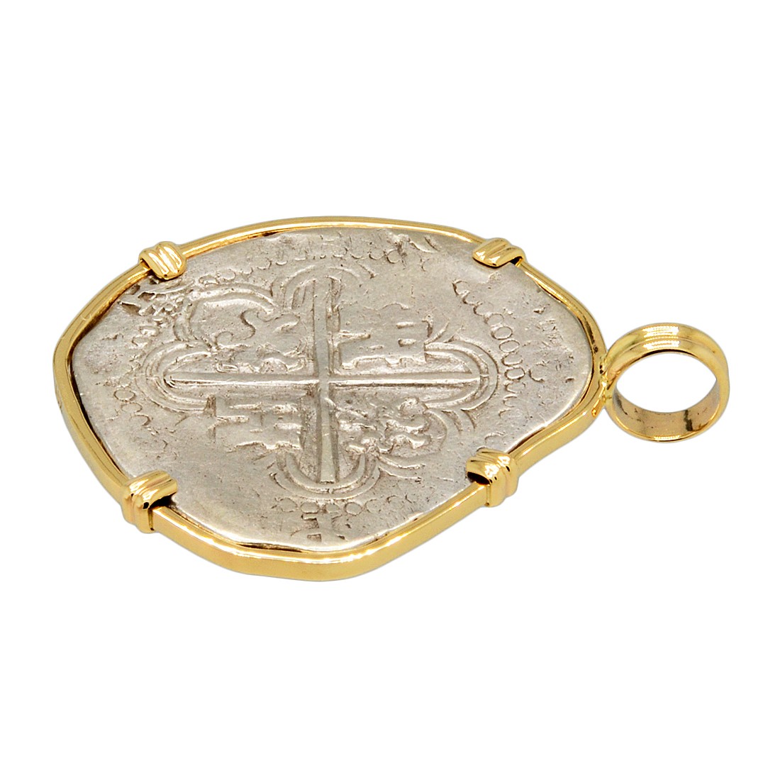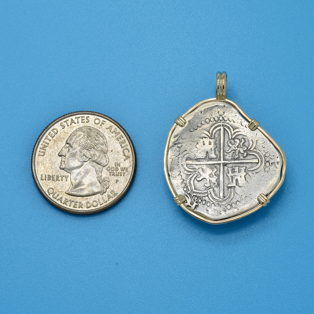 Spanish coins, known as "cobs", that circulated in this epic era were hand struck from dies and cut to weight. Minted in five denominations in silver, the largest was the eight reales, famous in the colonies and among pirates as a “Piece of Eight.” The other denominations were four reales, two reales, one real and half real. Cob coinage with their unusual shapes are all unique and each is a one-of-a-kind piece of history.
