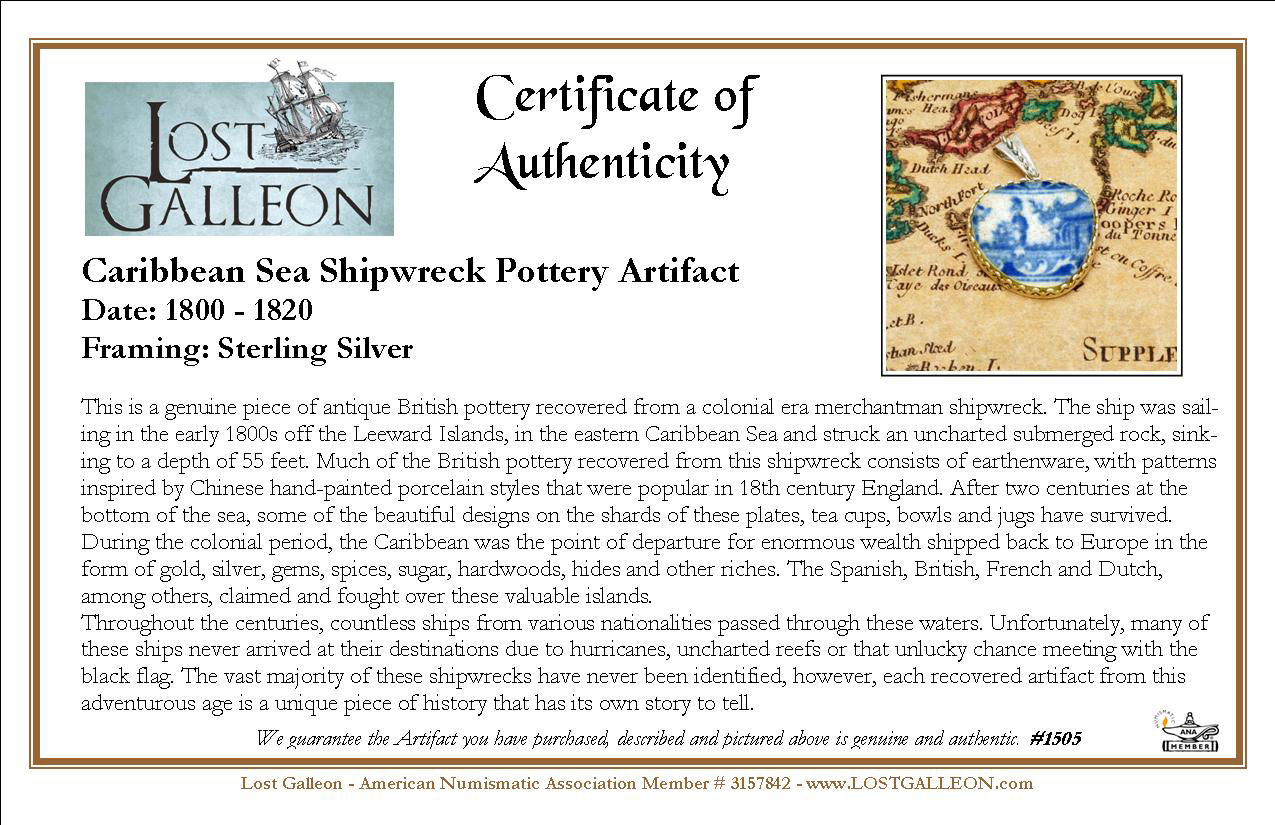 This is a genuine piece of antique British pottery recovered from a colonial era merchantman shipwreck. The ship was sailing in the early 1800s off the Leeward Islands, in the eastern Caribbean Sea and struck an uncharted submerged rock, sinking to a depth of 55 feet. Much of the British pottery recovered from this shipwreck consists of earthenware, with patterns inspired by Chinese hand-painted porcelain styles that were popular in 18th century England. After two centuries at the bottom of the sea, some of the beautiful designs on the shards of these plates, tea cups, bowls and jugs have survived.