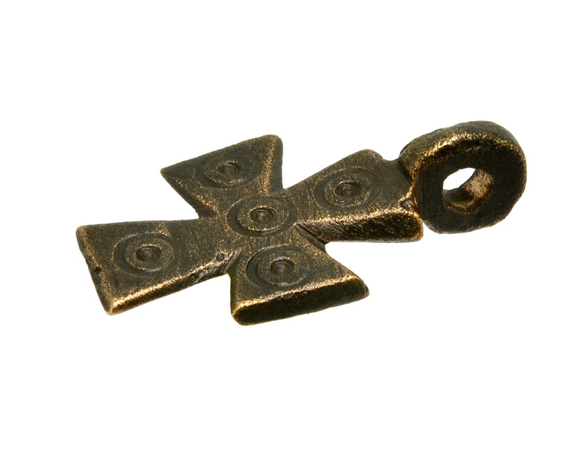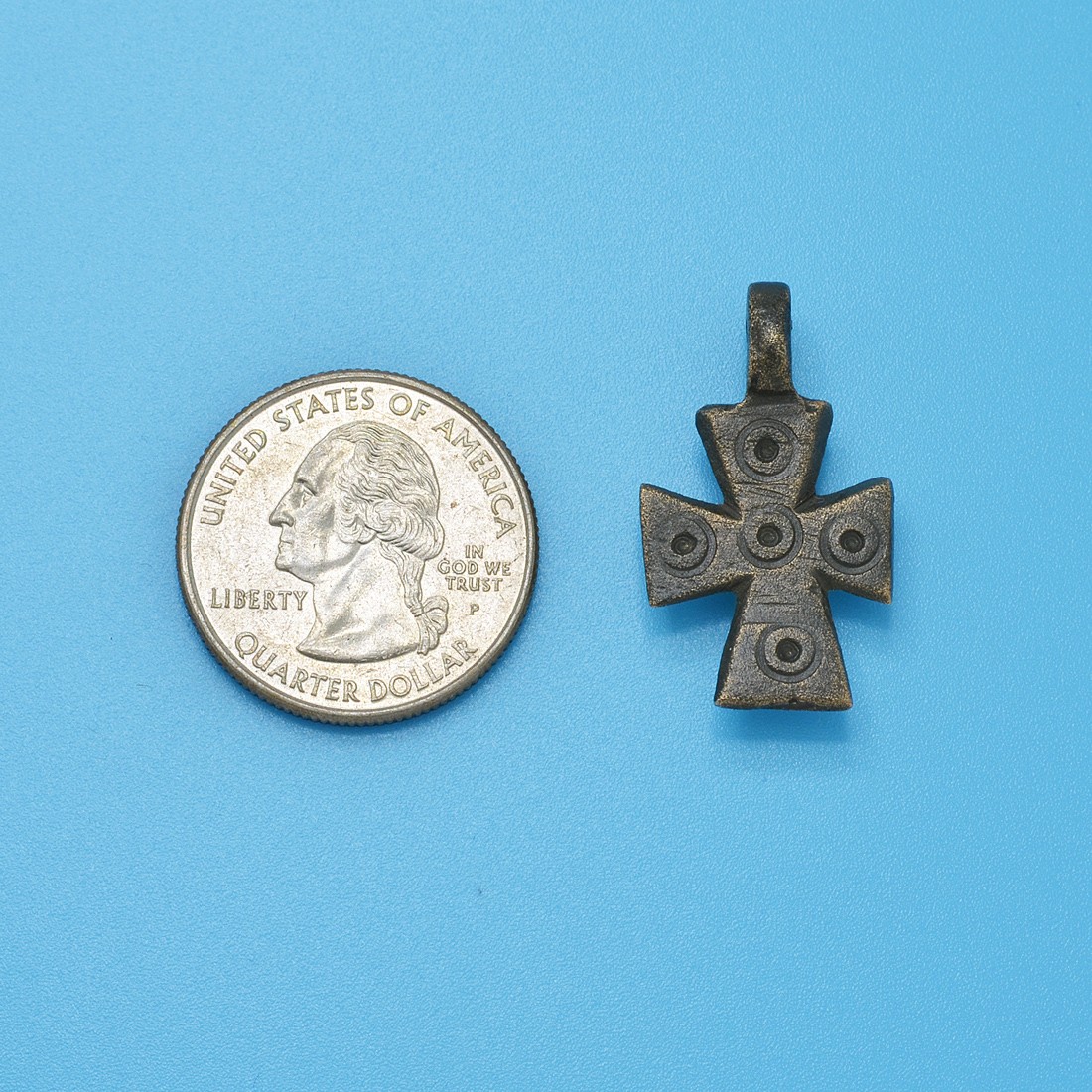 This bronze cross was hand forged during the Middle Ages in the cradle of Christianity, the Byzantine Empire. The front side of this cross is decorated with five punched-dots, which represented the "Five Wounds of Christ."