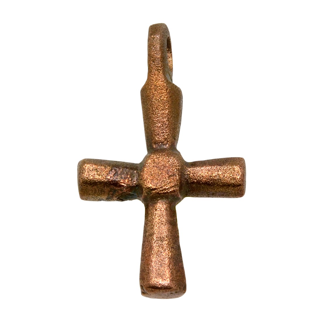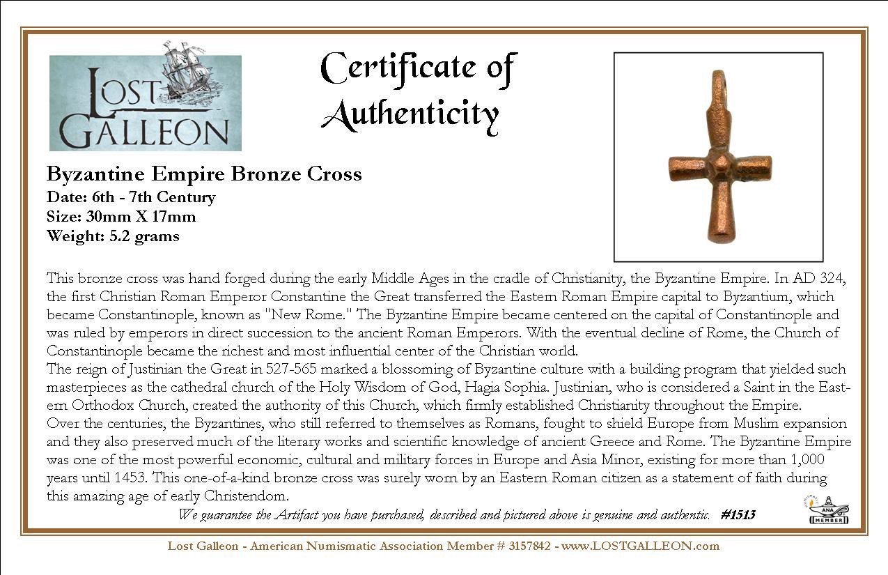 Over the centuries, the Byzantines, who still referred to themselves as Romans, fought to shield Europe from Muslim expansion and they also preserved much of the literary works and scientific knowledge of ancient Greece and Rome. The Byzantine Empire was one of the most powerful economic, cultural and military forces in Europe and Asia Minor, existing for more than 1,000 years until 1453. This one-of-a-kind bronze cross was surely worn by an Eastern Roman citizen as a statement of faith during this amazing age of early Christendom.