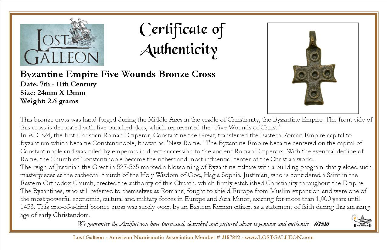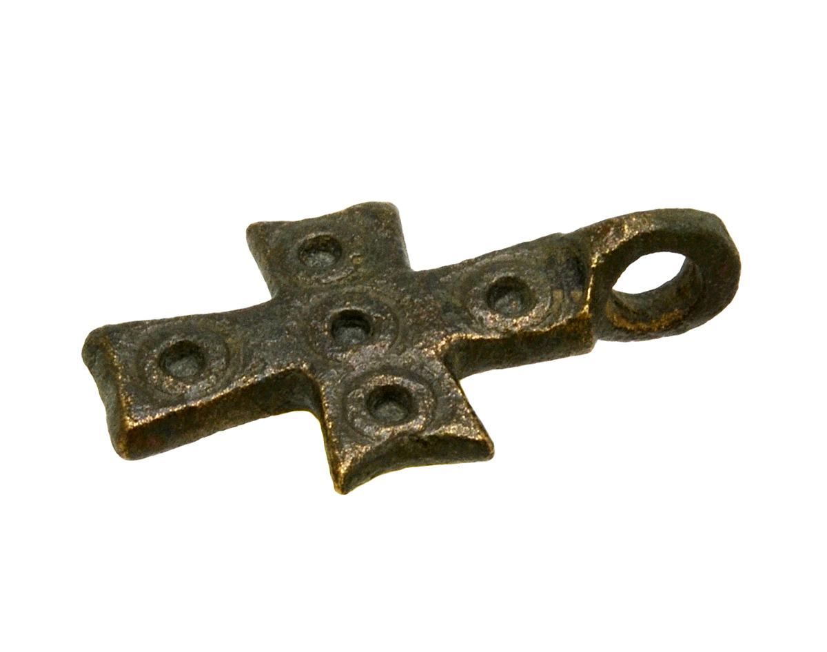 This bronze cross was hand forged during the Middle Ages in the cradle of Christianity, the Byzantine Empire. The front side of this cross is decorated with five punched-dots, which represented the "Five Wounds of Christ."