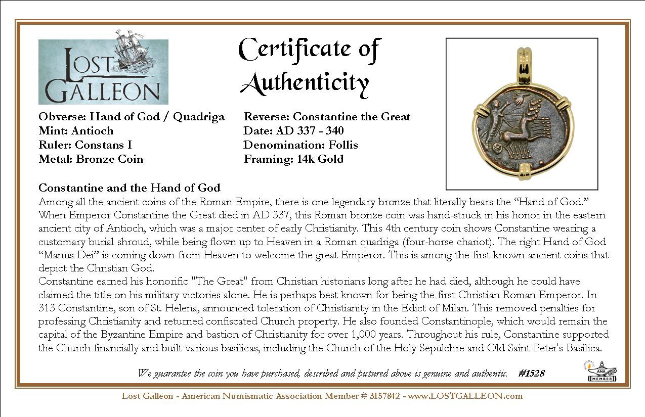 Among all the ancient coins of the Roman Empire, there is one legendary bronze that literally bears the “Hand of God.” When Emperor Constantine the Great died in AD 337, this Roman bronze coin was hand-struck in his honor in the eastern ancient city of Antioch, which was a major center of early Christianity. This 4th century coin shows Constantine wearing a customary burial shroud, while being flown up to Heaven in a Roman quadriga (four-horse chariot). The right Hand of God “Manus Dei” is coming down from Heaven to welcome the great Emperor. This is among the first known ancient coins that depict the Christian God.