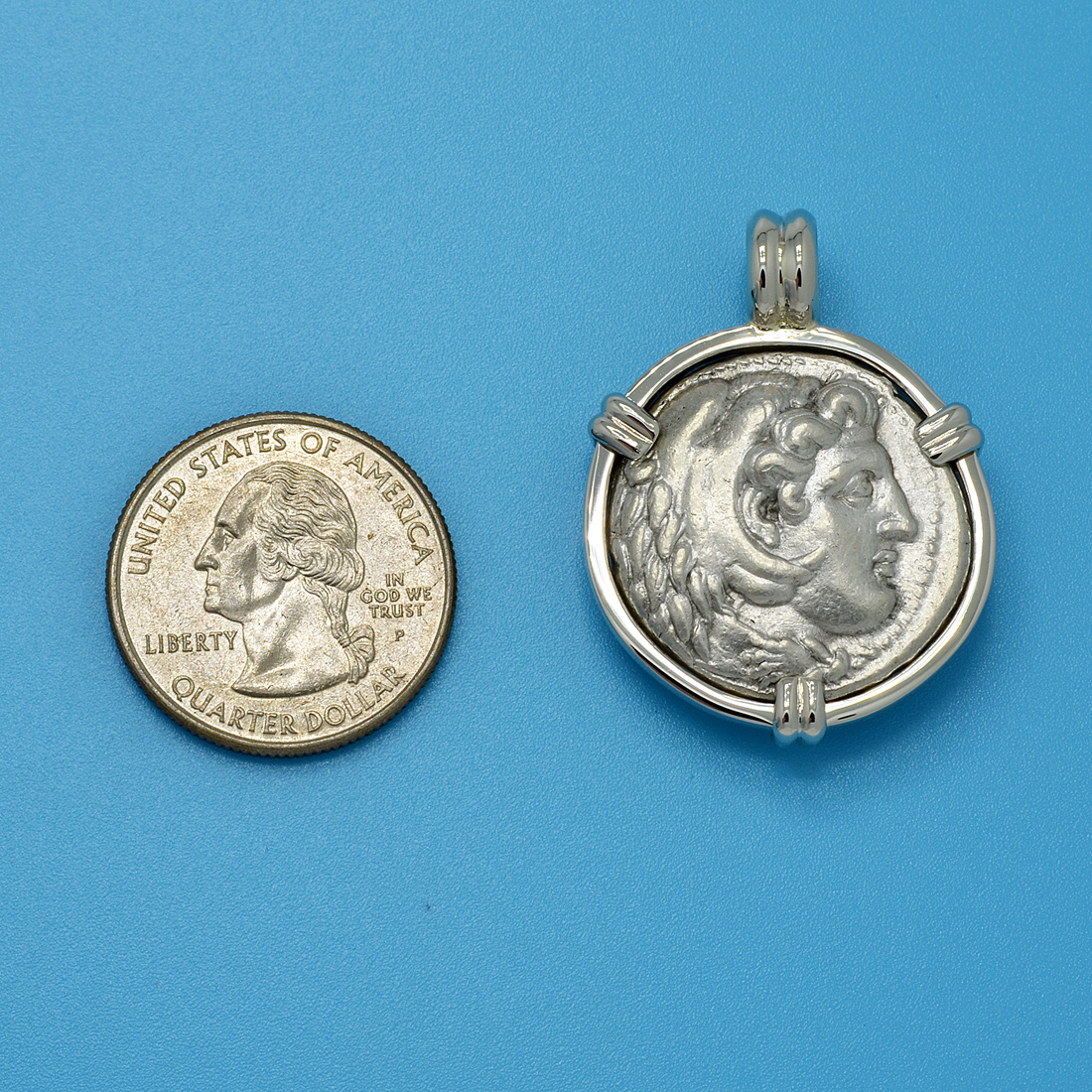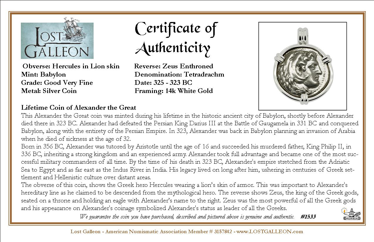 This Alexander the Great coin was minted during his lifetime in the historic ancient city of Babylon, shortly before Alexander died there in 323 BC. Alexander had defeated the Persian King Darius III at the Battle of Gaugamela in 331 BC and conquered Babylon, along with the entirety of the Persian Empire. In 323, Alexander was back in Babylon planning an invasion of Arabia when he died of sickness at the age of 32.